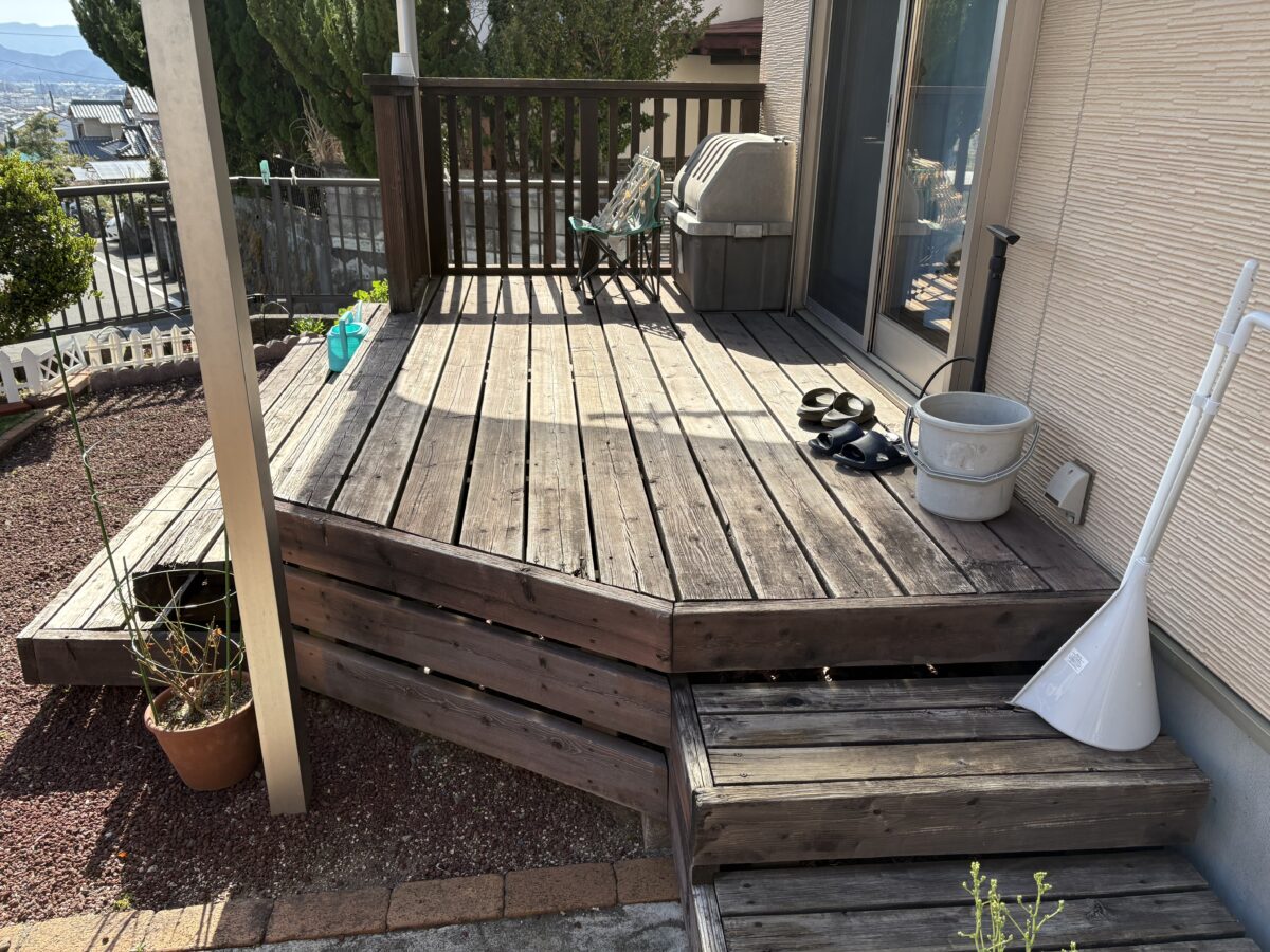 本日より、静岡県三島市にて外壁塗装工事がスタートいたしました。今回の工事では、外壁の塗り替えに加えウッドデッキも新しくしたいというお客様のご要望をいただきましたので、足場仮設工事に入る前に既存ウッドデッキの採寸および解体撤去を行いました。