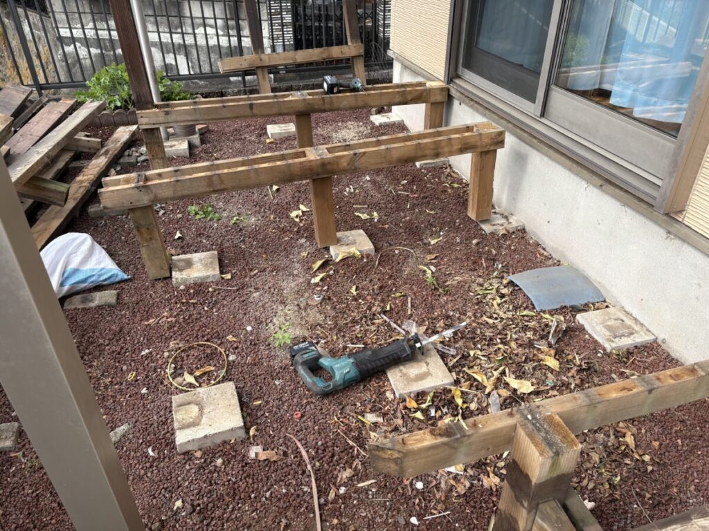 既存のウッドデッキはビス留めでしっかり固定されていましたので、まずはインパクトドライバーを使って一本ずつビスを外していきます。無理に壊すのではなく、周囲を傷つけないよう丁寧に分解していくのがポイントです。