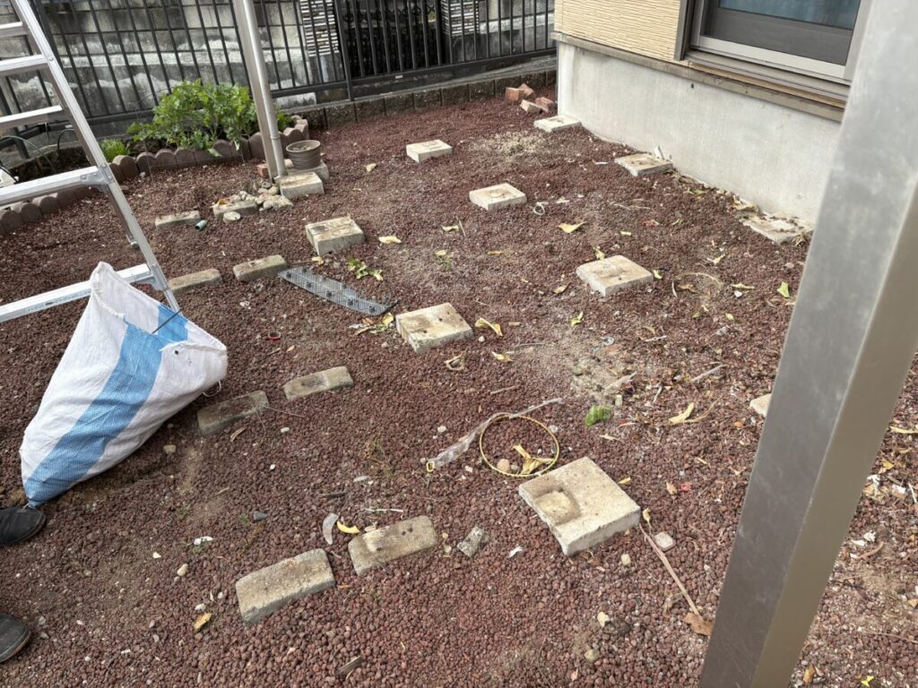 まずは採寸作業からスタートです。既存のウッドデッキは天然木で造られており、今回も同様に天然木で、かつできるだけ現状に近いサイズ感での再施工をご希望でした。そのため、単純な寸法取りではなく、細部まで丁寧に確認しながら採寸を行いました。柱の位置や高さ、床板の張り方向、束石の配置など、仕上がりに影響するポイントを一つひとつチェックしていきます。特に天然木は材料の個体差もあるため、現地に合わせた柔軟な施工が必要になります。そのためにも、この採寸作業は非常に重要な工程となります。