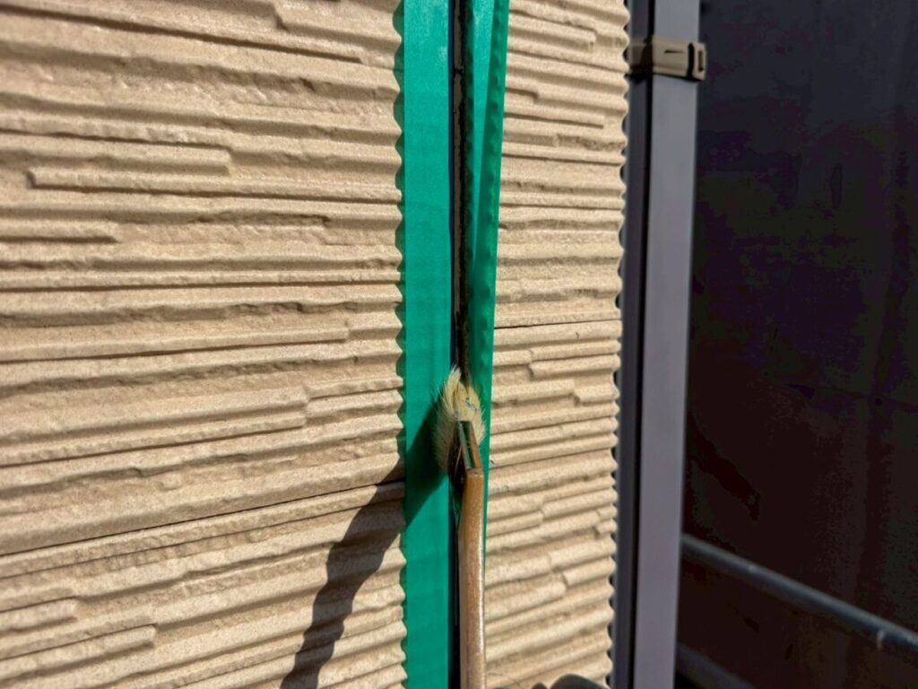 養生が完了したら、次にプライマーを塗布していきます。プライマーは接着剤のような役割を持ち、新しく充填するシーリング材と下地との密着性を高めるために欠かせない工程です。塗り残しがないよう均一に塗布し、しっかりと乾燥させます。