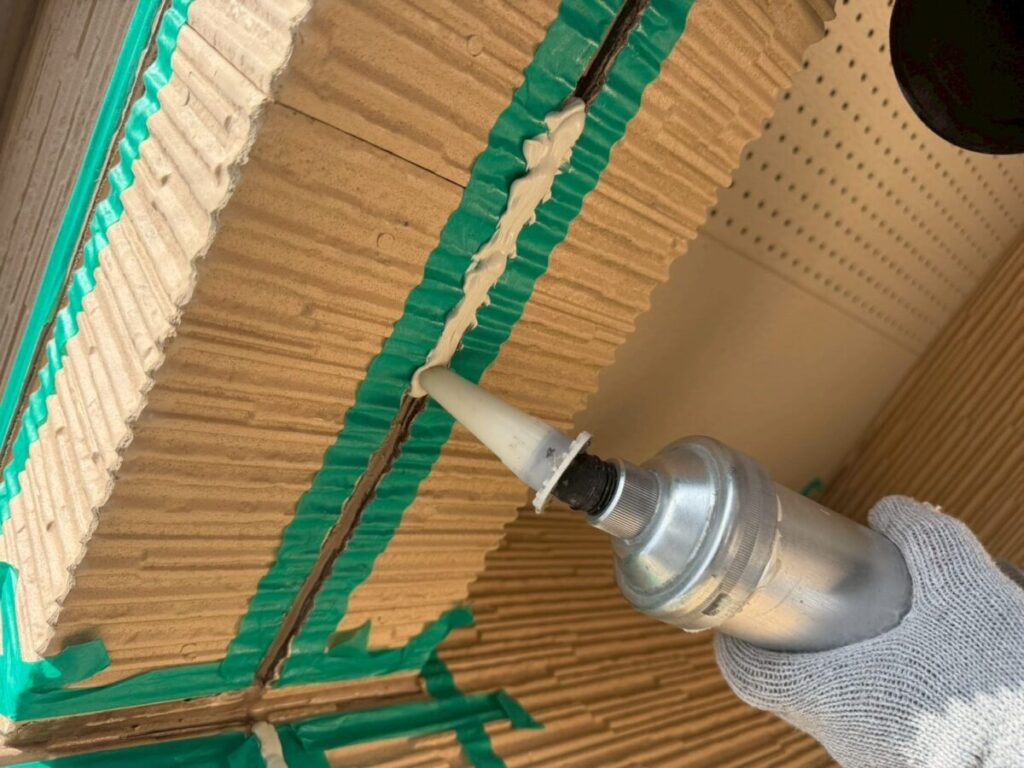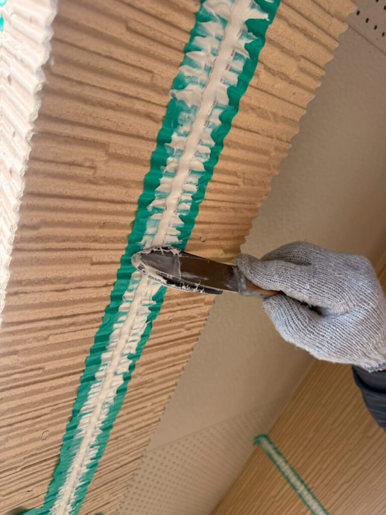 シーリング材を目地に沿って丁寧に充填した後は、ヘラを使って表面を均していきます。この仕上げ作業によって、見た目が整うだけでなく、防水性能も向上します。空気が入らないように注意しながら、均一な厚みになるよう仕上げていきます。