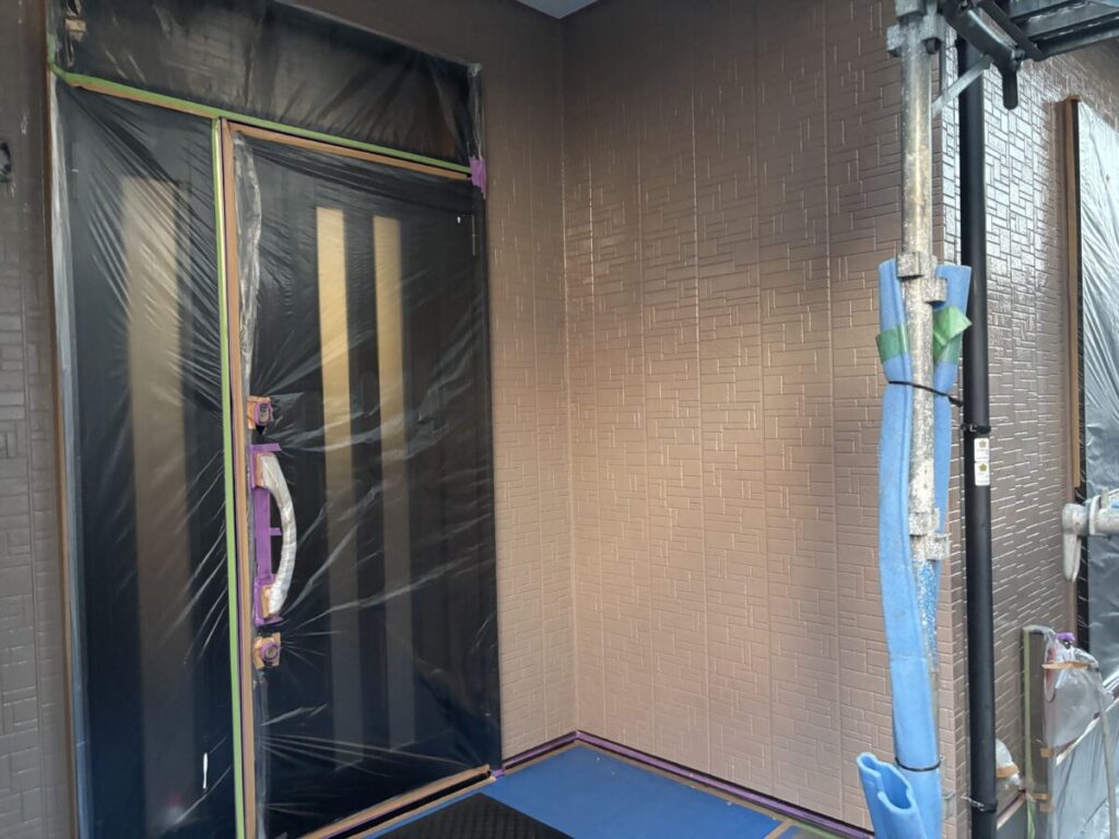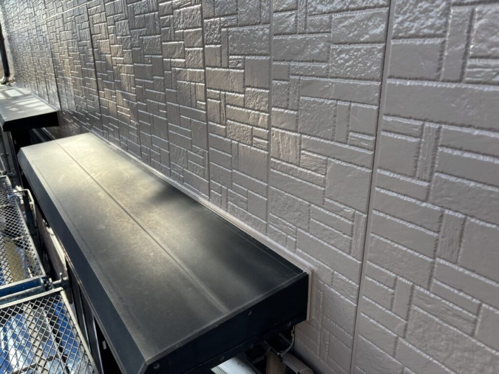 外壁は上塗りまで進んでいます。今回の外壁塗料は日本ペイントさんのグランセラトップ2液ファインを選定されました。こちらのグランセラトップ2液ファインは無機塗料になります。期待耐用年数は20年と長いです。