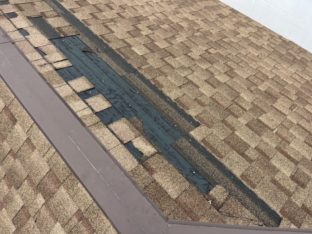 現地を確認すると、屋根材の一部が強風で千切れてしまい、防水シートであるルーフィングが見えている状態でした。