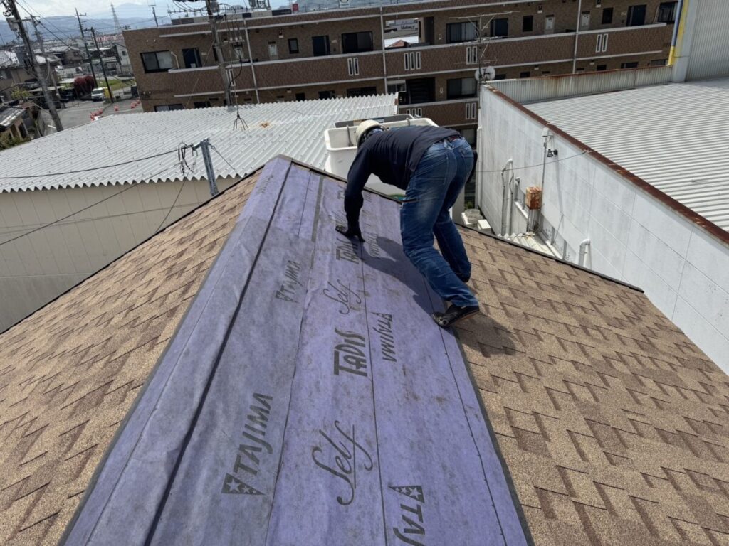 この段階では、すぐに雨漏りしているわけではありません。というのも、屋根材の下には既存のルーフィングが残っているため、ひとまず雨水の侵入を防いでくれているからです。ですが、ルーフィングが紫外線や風雨にさらされた状態が続くと、傷んだり破れたりする恐れがあります。そうなると一気に雨漏りへつながってしまうため、工事までの間の対策として、粘着層付きのルーフィングを上から貼り、応急処置を行いました。