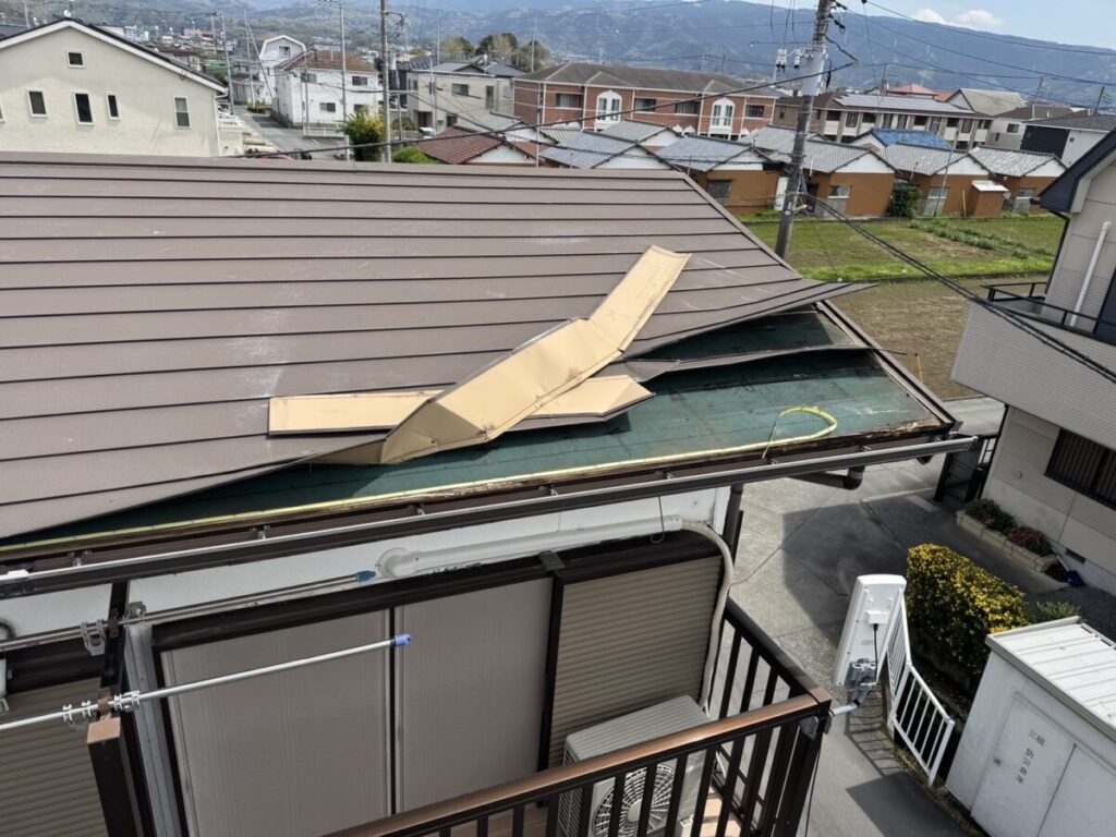 屋根が一度めくれてしまうと、そこから風を受けやすくなり、被害が一気に広がることがあります。特に金属屋根は、部分的な浮きやめくれを放置してしまうと、次の強風時にさらに飛散してしまう危険もあります。そのため、本格的な工事を行うまでの間に、これ以上被害が拡大しないよう応急処置をさせていただきました。
