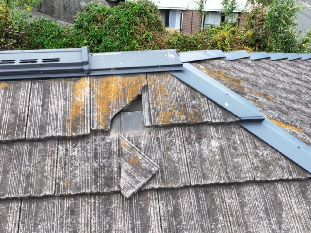 屋根のてっぺん付近の瓦が割れているので見てほしいとご相談があり現地調査にお伺いいたしました。屋根は寄棟屋根で乾式コンクリート瓦で葺かれていました。早速ドローンで屋根全体の破損を確認していきます。