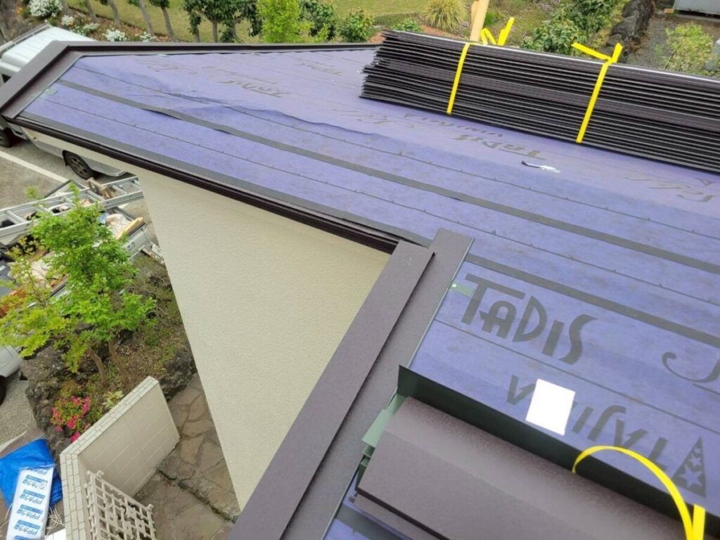 ルーフィングの施工が完了した後は、屋根の端部に取り付ける軒先水切りやケラバ板金などの役物板金を取り付けていきます。