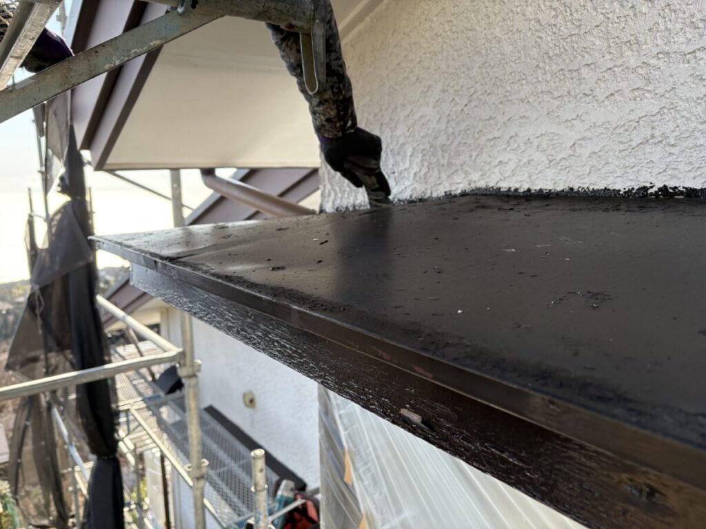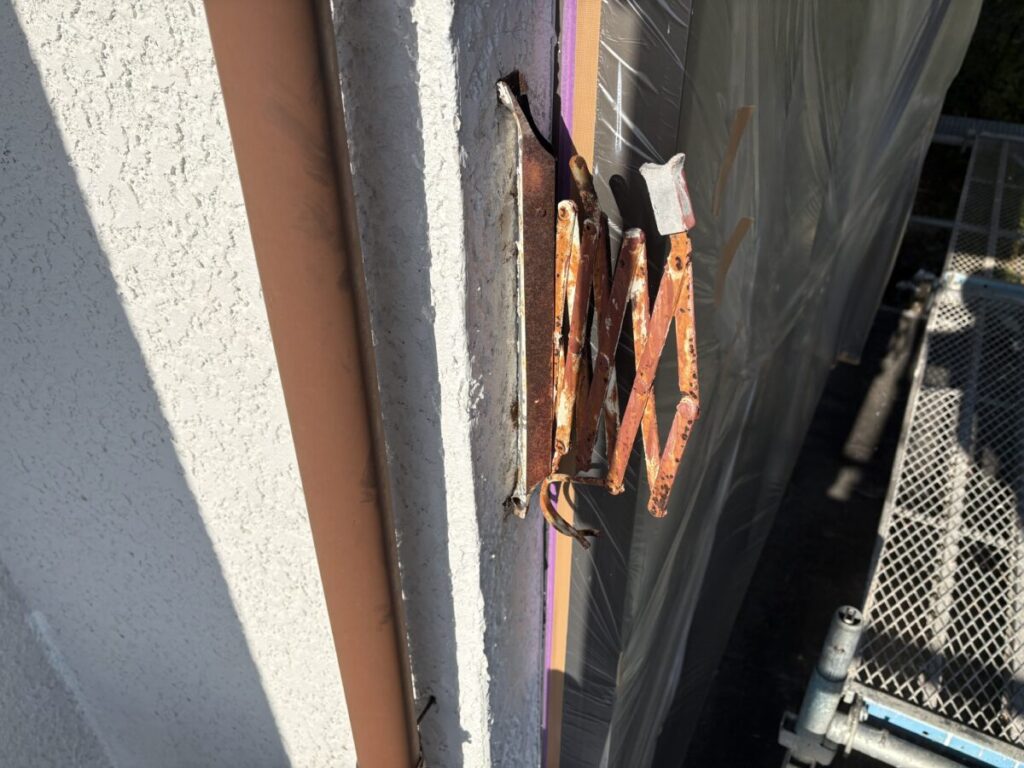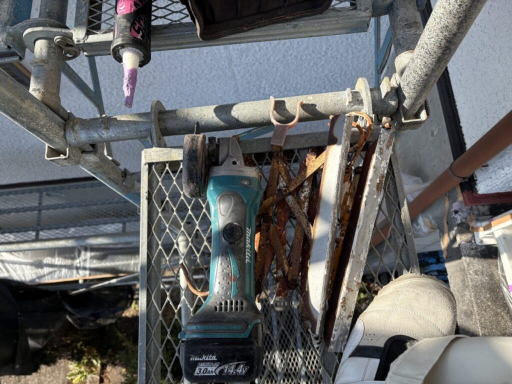 物干し竿掛けを撤去している間に塗装職人さんは養生をしたり、鉄部のケレン作業をしていました。
