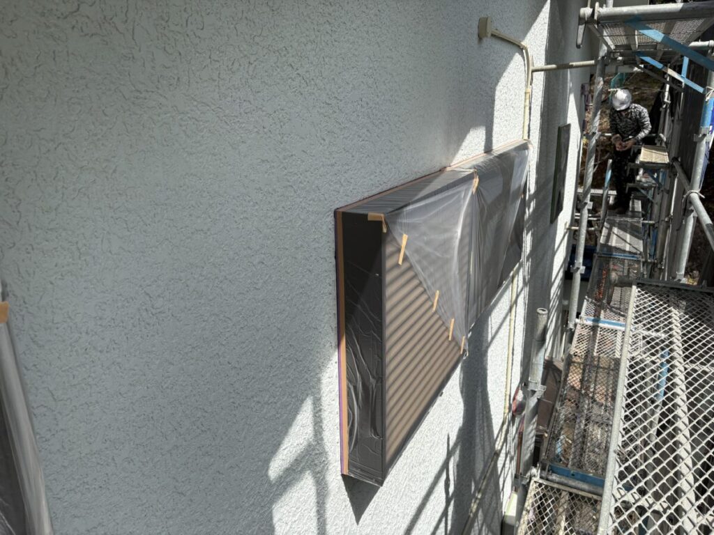 続いて、次の工程は外壁塗装へと進んでまいります。外壁塗装に入る前には、非常に重要な工程である養生作業を行います。養生とは、塗装しない部分、例えば窓ガラスやサッシ、玄関ドア、設備機器などに塗料が付着しないよう、ビニールやテープなどで丁寧に保護する作業のことです。