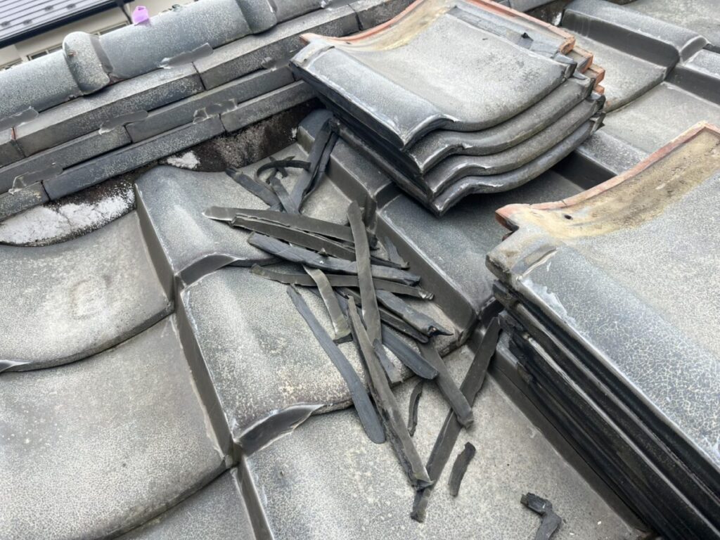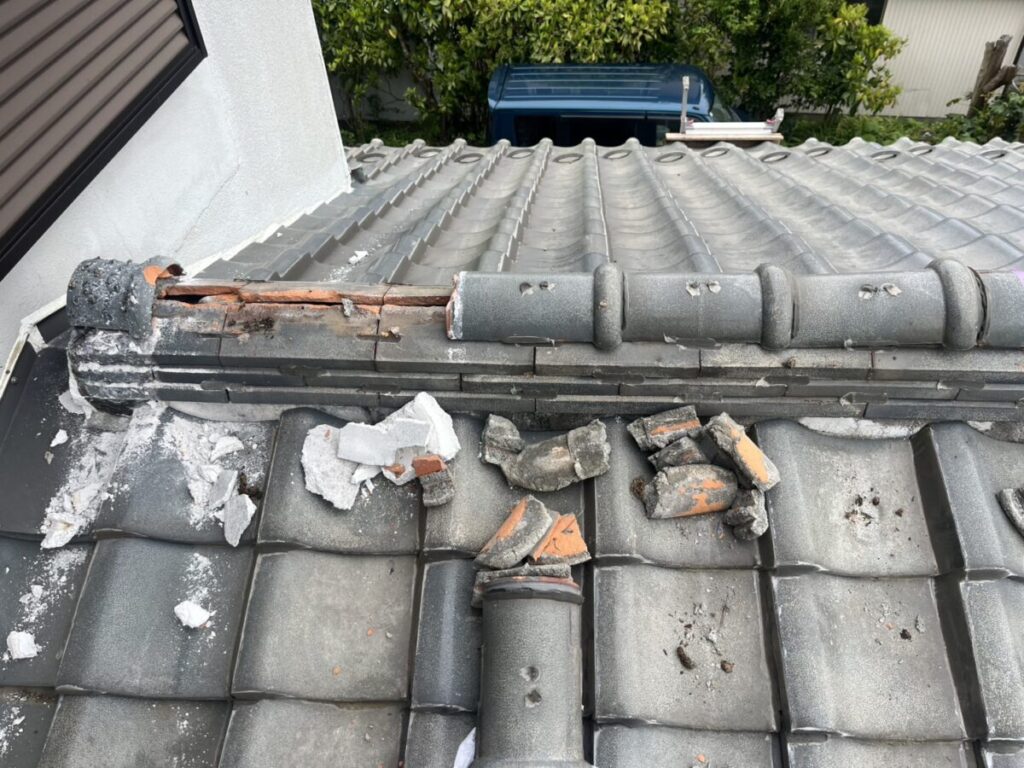 次に棟瓦をバラそうとしたら、何とモルタルで積んでいました!瓦を剥がすだけで時間が掛かりそうです…