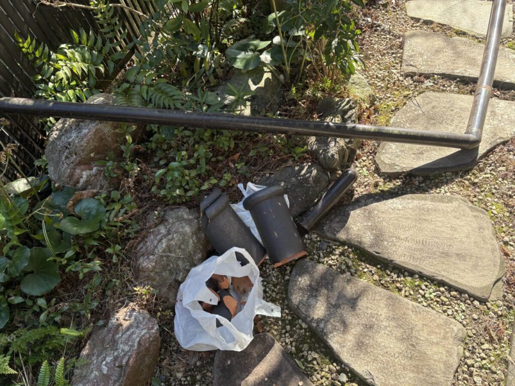 強風で冠瓦が飛んでしまい、雨樋も破損したとの事です。