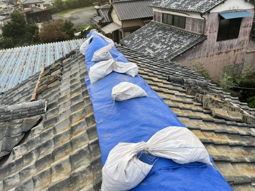 崩した棟瓦付近は、雨が降っても大丈夫な様にブルーシートを引いて今日の作業は、終わりにします!