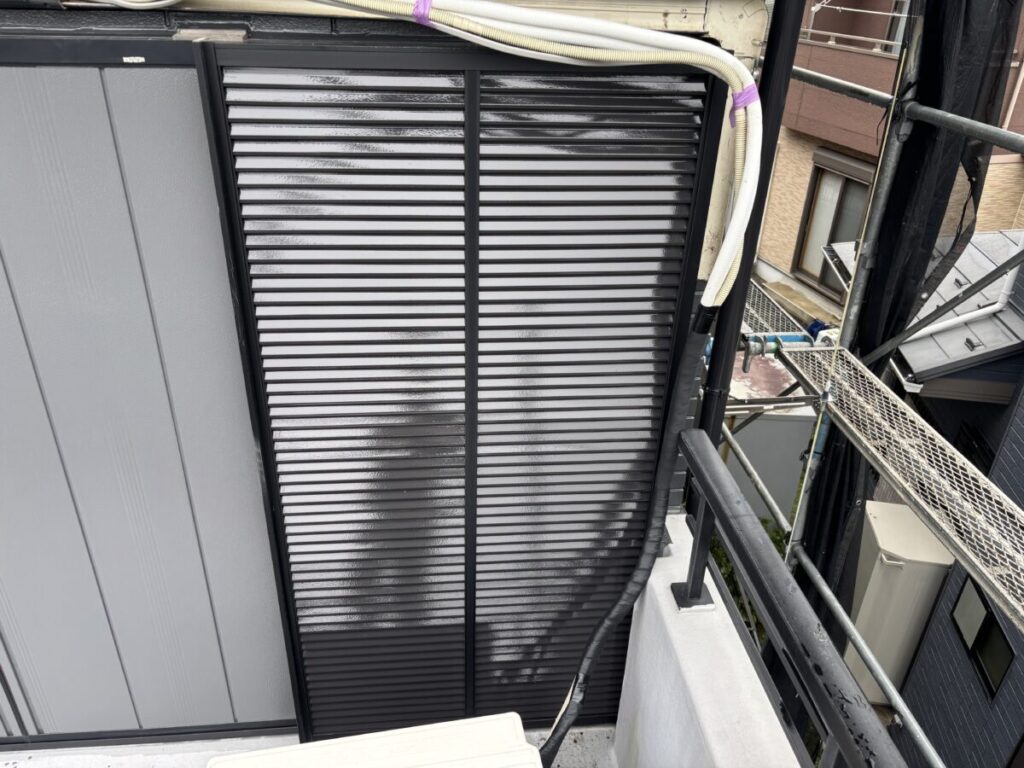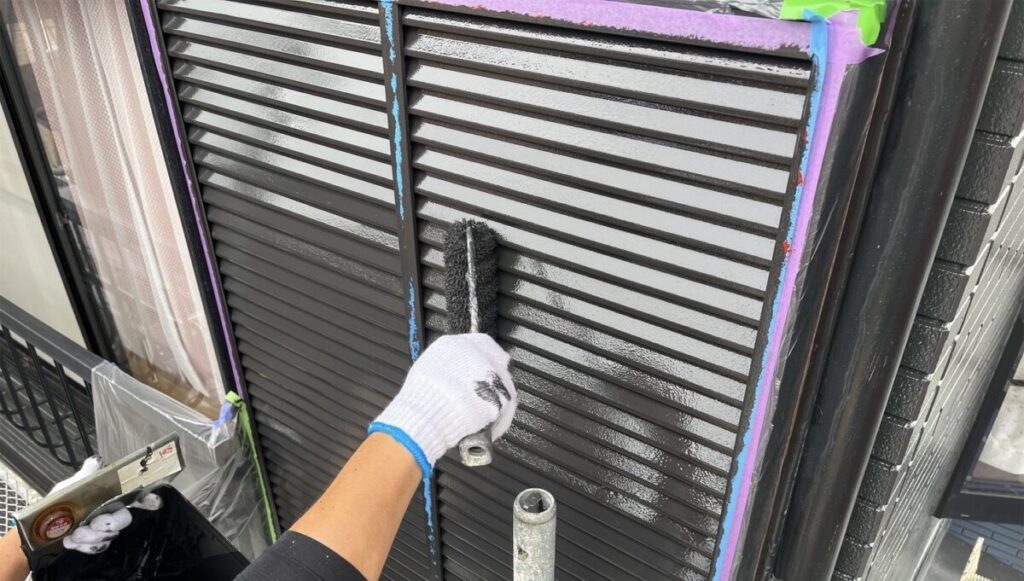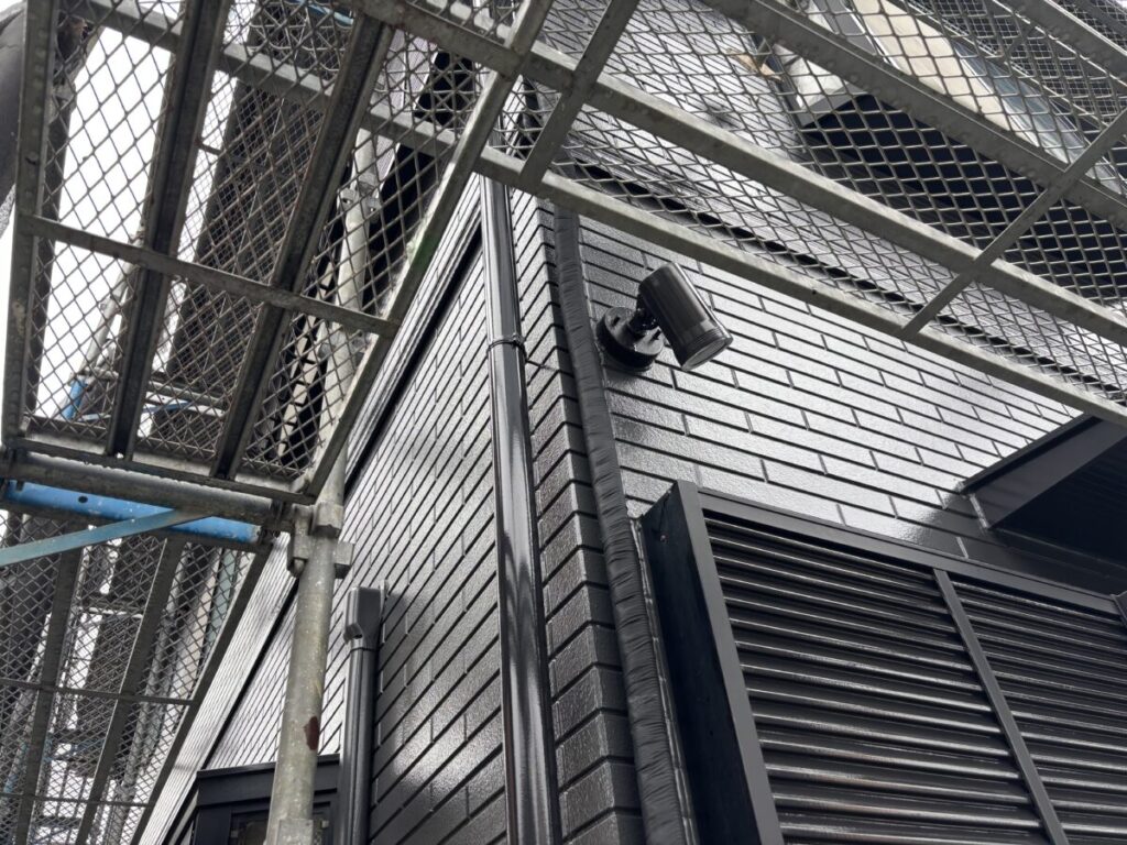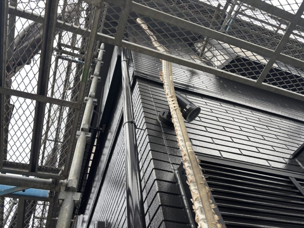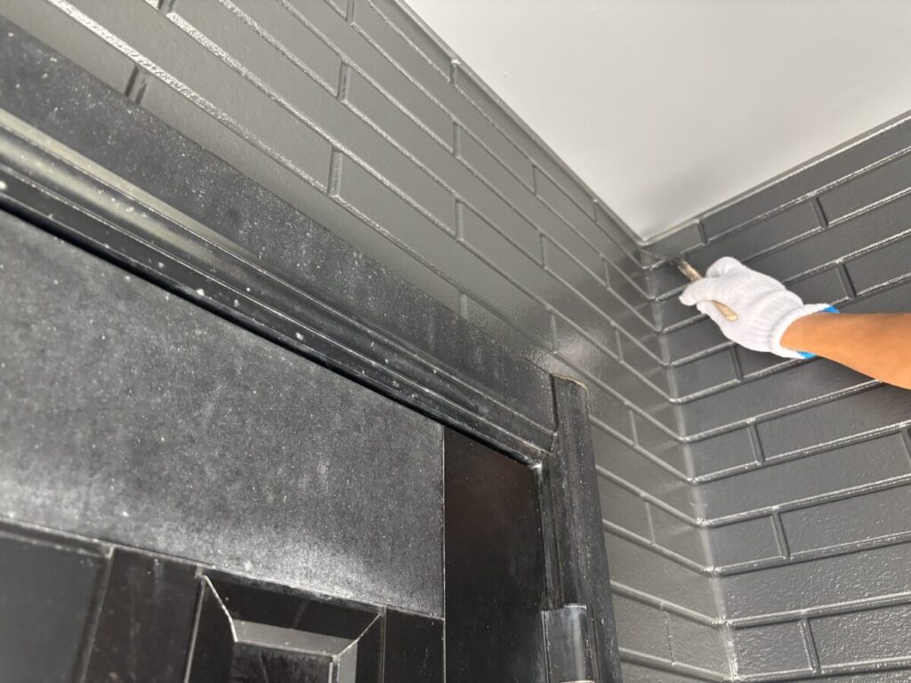 付帯部の上塗り作業中です。付帯部はエスケープレミアムNADシリコン(弱溶剤、ラジカル制御)を使用しています。