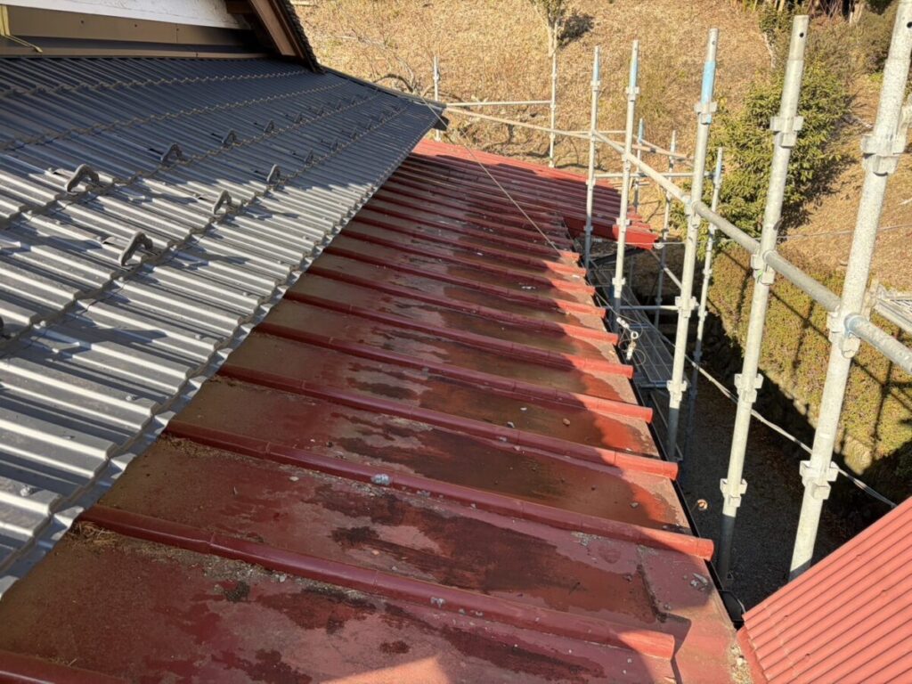 まずは既存の瓦棒屋根を丁寧に撤去する作業からスタート。長年、雨風や紫外線にさらされてきた屋根材は傷みも進んでいます。