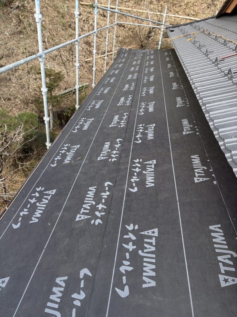 下地が整ったら、防水の要となるルーフィング(防水シート)を施工。雨水の侵入を防ぐ大切な工程なので、重ね幅や納まりを細かく確認しながら慎重に張り進めていきました。見えなくなる部分ですが、屋根の寿命を左右する非常に重要な作業です。