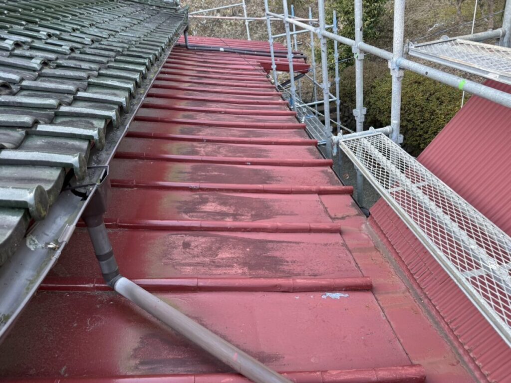 今回の工事では、既存の瓦屋根からレクトプルーフへ、そして立葺き部分は立平葺きへと葺き替えを行いました。屋根全体を軽量化することで、建物への負担も軽くなり、今後の耐震面でも安心できる仕様になっています。工事期間中にはまさかの降雪。小山町はやはり冷え込みますね。朝現場に来ると屋根が真っ白になっていた日もありました。安全第一ですので無理はせず、雪下ろしや、溶けるのを待ちながら工程を調整しましなんとか月内に完了することができました。