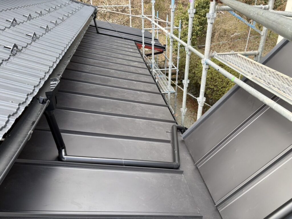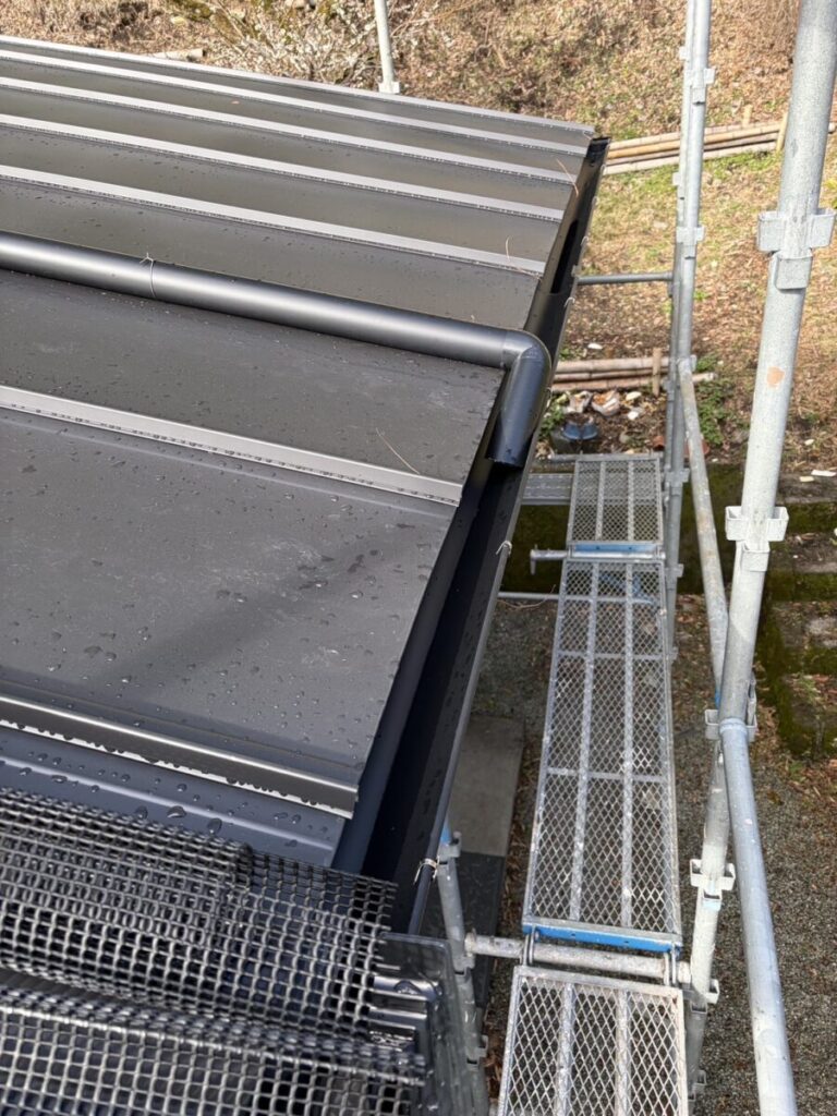 レクトプルーフは重厚感があり、仕上がりも非常にきれいです。立平葺き部分も継ぎ目が少なく、スッキリとしたラインに仕上がっています。屋根が変わると建物の印象もぐっと引き締まりますね。