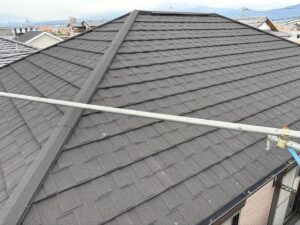 今回お施主様からご相談は屋根材がポロポロと屋根から降ってくるのが心配というご相談でした。現地に伺い、ドローンで調査をしたところ25年位前に屋根リフォームをされていました。新築当時の「化粧スレート」の上に重ね葺きで「セキスイかわらU」が施工されていました。「セキスイかわらU」はノンアスベストタイプの耐久性に問題のある屋根材のため劣化して割れや破損が多くみられ、既存の化粧スレートが見えている部分もありました。屋根が2重のためすぐに雨漏りすることはありませんが、かわらUの屋根材を施工する際に多くの釘が化粧スレートを貫通しているので釘からの雨漏りと、強風で屋根材が飛ばされるリスクがありましたので「かわらU」を撤去して新築当時の「化粧スレート」の上にカバー工法で金属製の屋根材「シルキーG2」を施工するご提案をさせていただきました。