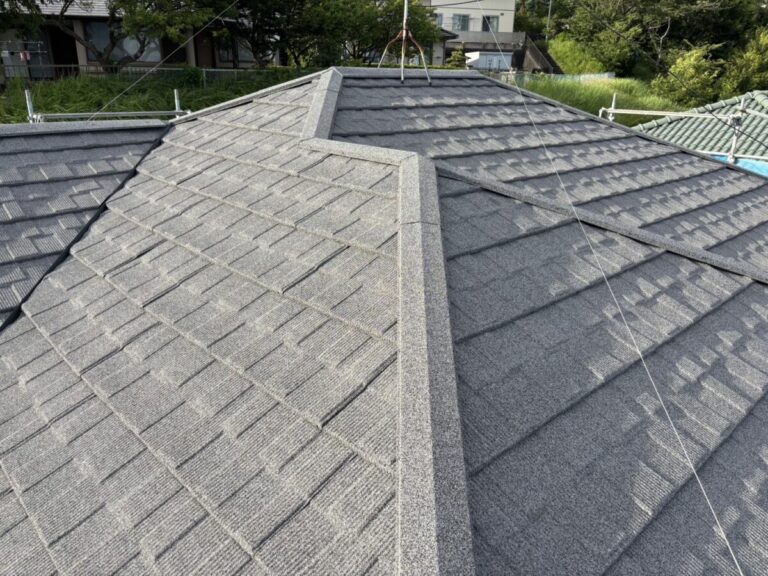 「グリシェイドNEO」の上にカバー工法で天然石付きガルバリウム鋼板「セネター」を重ね葺き 施工前 現地調査 ご提案 屋根診断のご依頼があり現地調査に伺いました。ドローンで屋根の現在の状態と屋根材の特定を行っていきます。既存の屋根材は旧クボタの「グリシェイドNEO」(