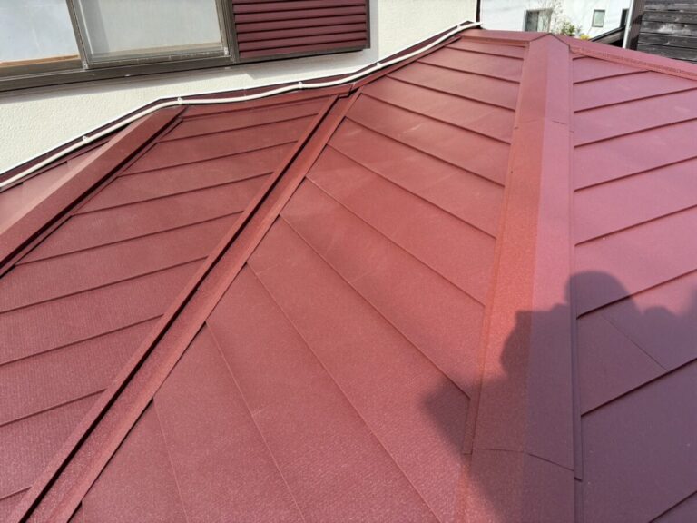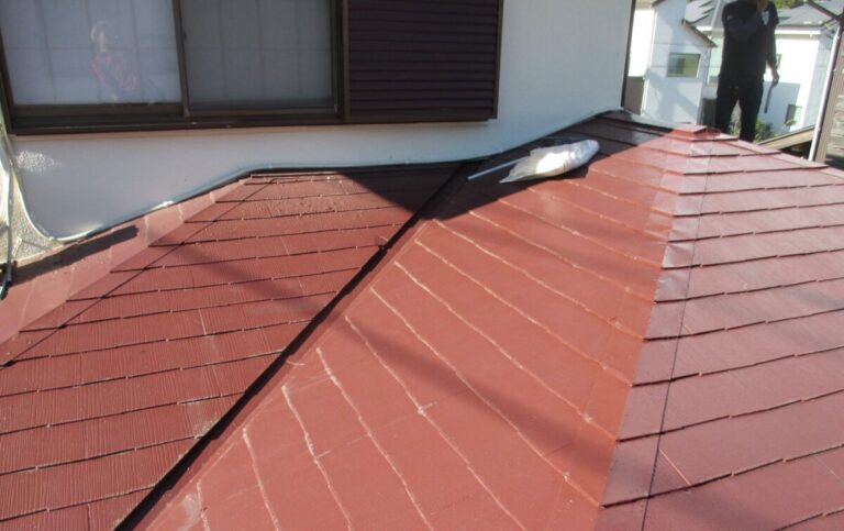 「化粧スレート」の上にカバー工法で「立平葺き」を重ね葺き工事 施工前 現地調査 ご提案 雨漏りのご相談があり現地調査に伺いました。室内には数か所雨漏りが発生している状況で、屋根の状態を確認すると屋根の傾斜が2寸勾配(11.3°)と緩い緩勾配の屋根になっていました。こ