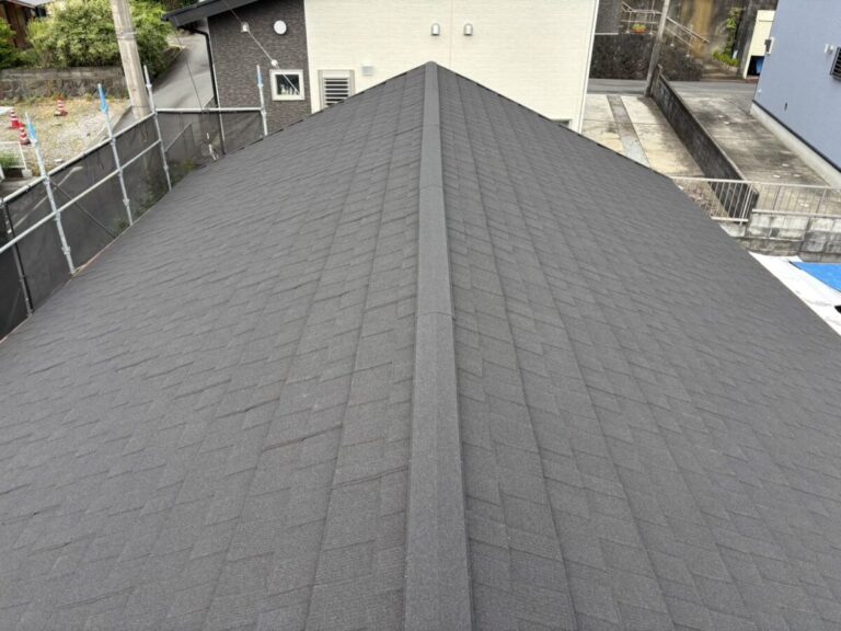 「グリシェイドNEO」の上にカバー工法で天然石付きガルバリウム鋼板「セネター」を重ね葺き 施工前 現地調査 ご提案 屋根診断のご依頼があり現地調査に伺いました。ドローンで屋根の現在の状態と屋根材の特定を行っていきます。既存の屋根材は旧クボタの「グリシェイドNEO」(