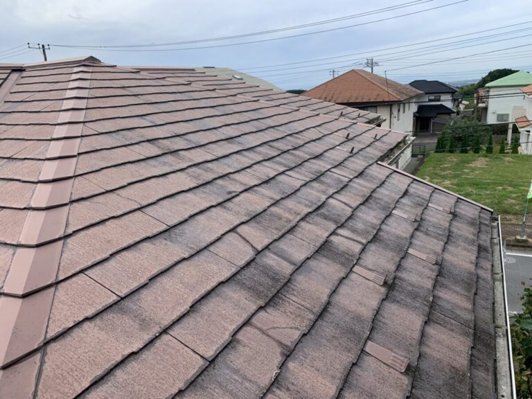 劣化した「コロニアルNEO」の上に→「セネター」をカバー工法 施工前 現地調査 ご提案 「屋根材の破片が落ちてくるので心配」とのご相談をいただき、屋根診断のため現地調査に伺いました。実際に屋根へ上がって確認していくと、屋根材は コロニアルNEO(クボタ/現ケイミュー