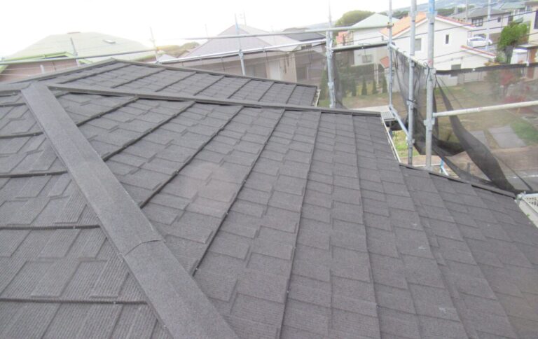 「陶器瓦」撤去→天然石ガルバリウム鋼板「セネター」に葺き替え工事 施工前 現地調査 ご提案 以前屋根工事を施工させていただいたお施主様からご紹介を頂きまして屋根の調査に伺いました。ドローンで屋根を見ていくと陶器瓦の青銅で所々浮きやカケ等がありましたが特に雨漏り等はご