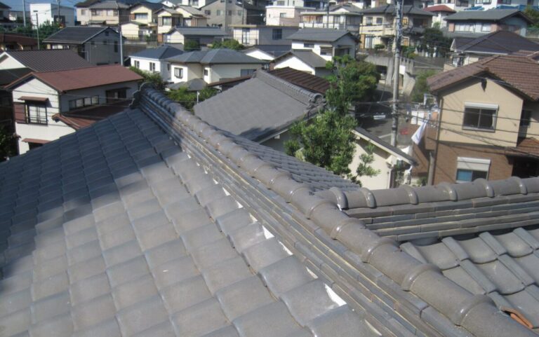 雨漏りが発生してしまった和風の瓦屋根の谷板金交換とルーフィング張り替え工事 施工前 現地調査 ご提案 三島市のお施主様より「雨漏りしているので一度見てほしい」と、ホームページをご覧になってお問い合わせをいただき、現地調査に伺いました。まずは屋根全体の状態を把握するた
