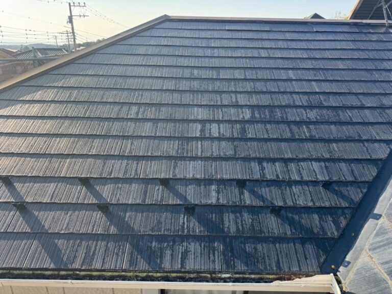 「化粧スレート屋根」→「TルーフモダンN」重ね葺き工事 施工前 現地調査 ご提案 お施主様から「数年前に屋根の一部が飛散したことがあり、現在の状態が心配だ」とご相談をいただき、現地調査に伺いました。屋根は普段じっくり確認する機会が少ないため、見た目に問題がなくても実