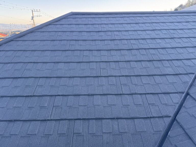 「化粧スレート屋根」→「シルキーG2」でカバー工法 施工前 現地調査 ご提案 新聞の折り込みチラシをご覧になったお客様から、雨漏りのご相談をいただき、現地調査にお伺いしました。既存の屋根材は化粧スレートで、築年数はおよそ50年ほど。長年にわたり紫外線や風雨にさらされ