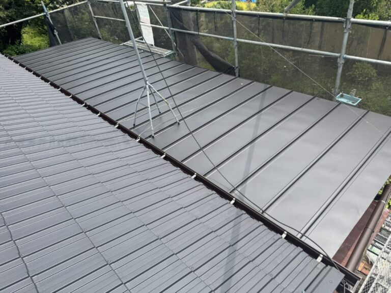 「化粧スレート」の上にカバー工法で「立平葺き」を重ね葺き工事 施工前 現地調査 ご提案 雨漏りのご相談があり現地調査に伺いました。室内には数か所雨漏りが発生している状況で、屋根の状態を確認すると屋根の傾斜が2寸勾配(11.3°)と緩い緩勾配の屋根になっていました。こ