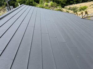 既存の大波スレートの山を合わせながら端から順番に下地の鉄骨に長いビスで留めていきます。棟から軒先までが1枚物で長いので2人での作業となります。