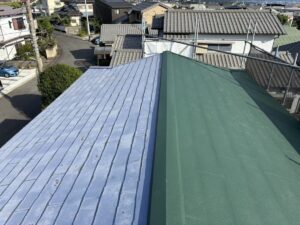 施工前の屋根材は1996年から2008年までニチハから製造販売されていた「パミール」で、ノンアスベスト屋根材初期にあたる商品で、当時ノンアスベストの屋根材の研究がまだ進んでいなかった事もあり、耐久性が低く、割れや層状剥離の発生、釘頭が腐食して屋根材が落ちてしまうなどの問題を抱えた屋根材でした。