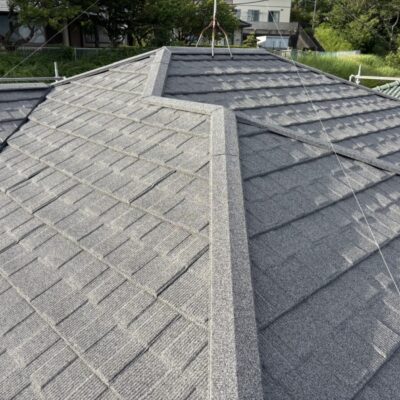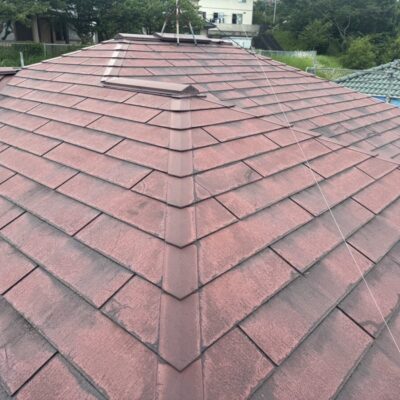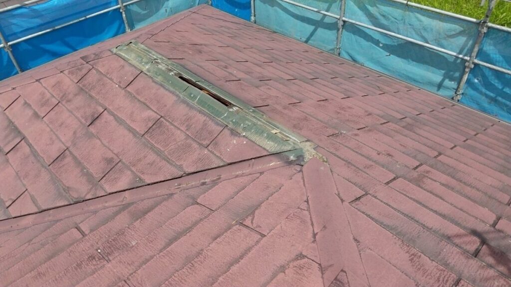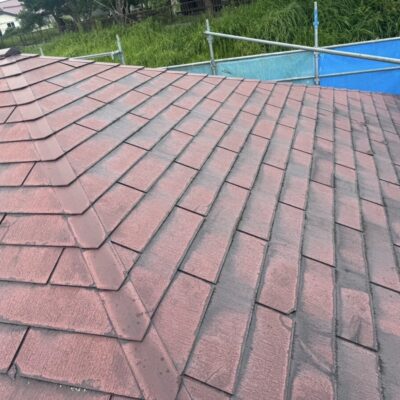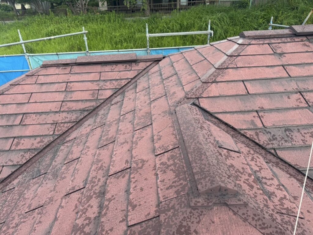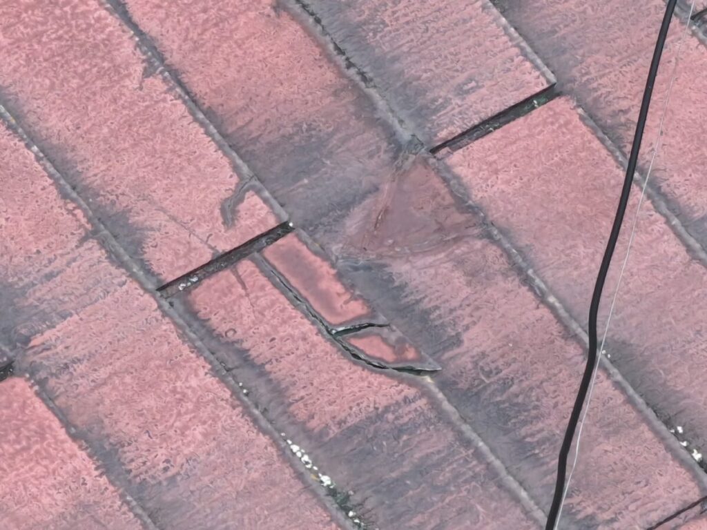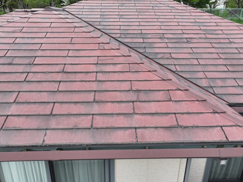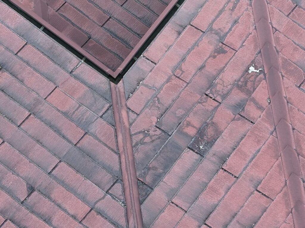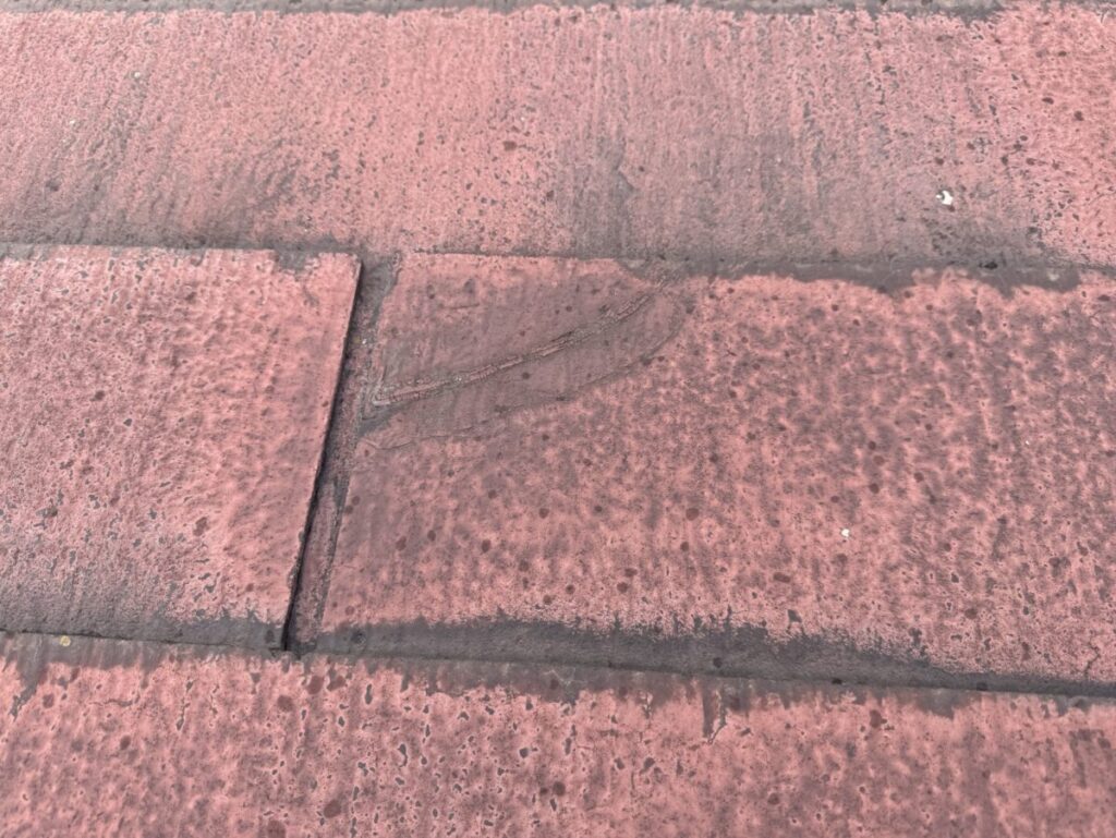 屋根診断のご依頼があり現地調査に伺いました。ドローンで屋根の現在の状態と屋根材の特定を行っていきます。既存の屋根材は旧クボタの「グリシェイドNEO」(現ケイミュー)の化粧スレート屋根材ででした。この屋根材はノンアスベストに切り替わった2001年〜2008年頃までの間に新築で施工されていたノンアスベスト屋根材で現在は廃盤となっている屋根材となります。強度を高めるためのアスベストが使用されなくなり耐久性の高い屋根材を作る技術が当時まだ低かっため、その頃のノンアスベストの屋根材は脆く割れやすいという特徴があります。現時点で数十枚の割れやカケが発生していました。以前他社様で塗装を実施されていましたが、多くのひび割れをコーキングで充填補修された跡がありました。塗装が不可のためカバー工法での重ね葺き工事のご提案させていただきました。