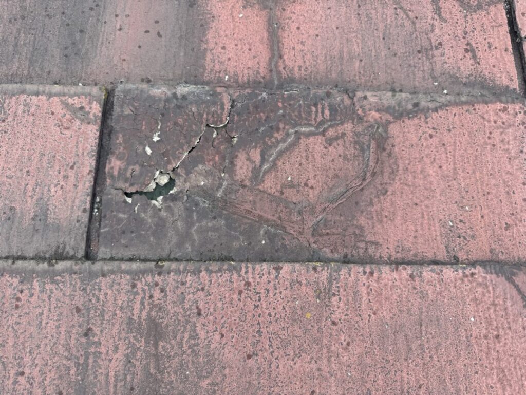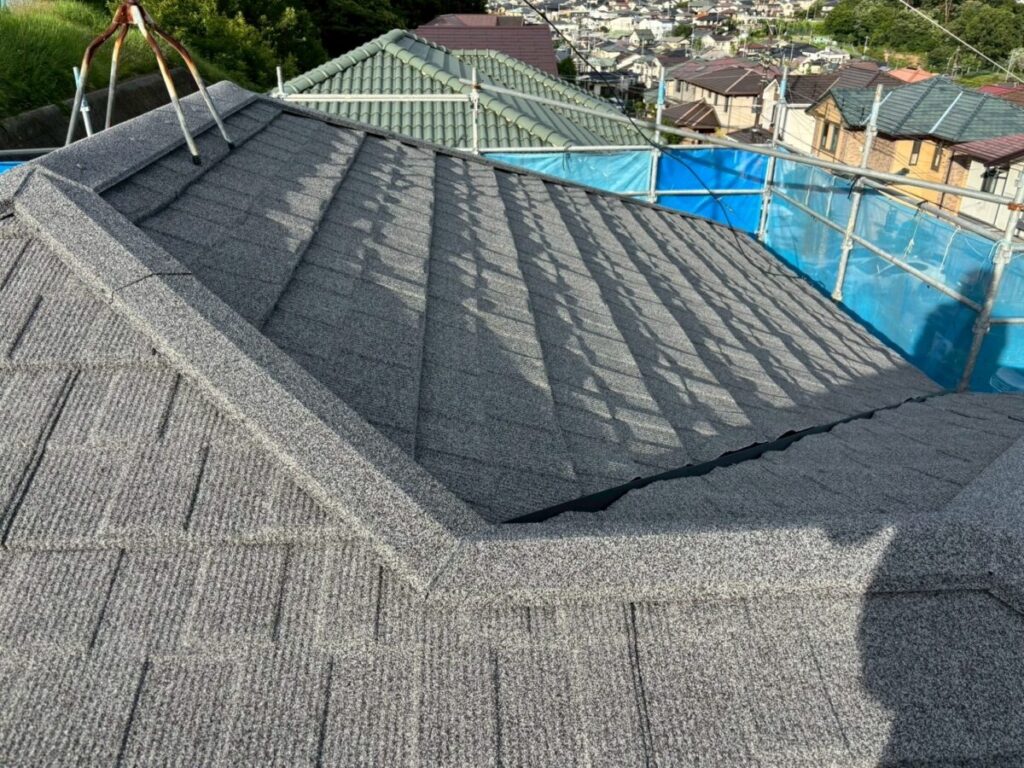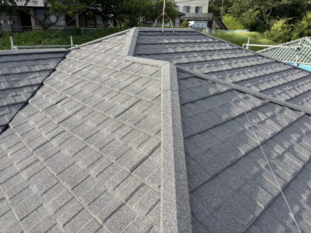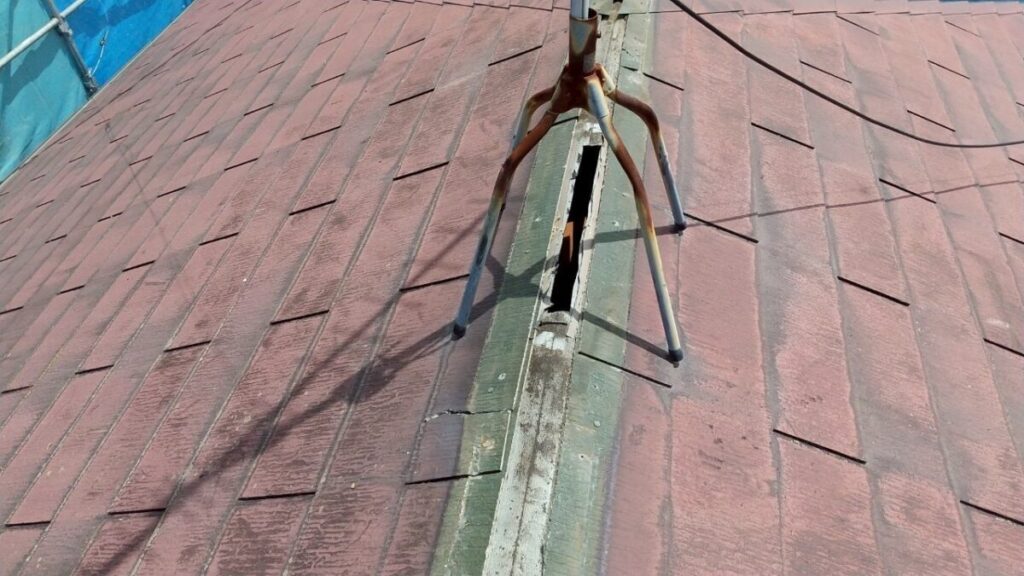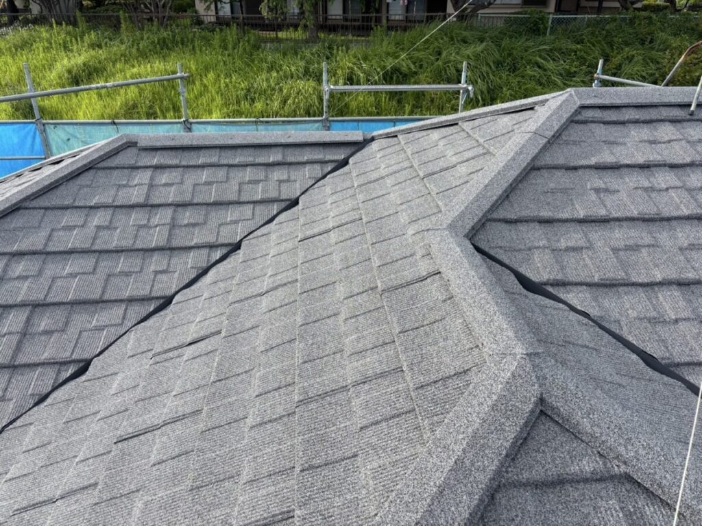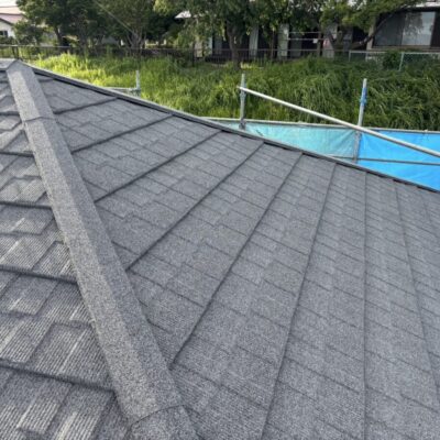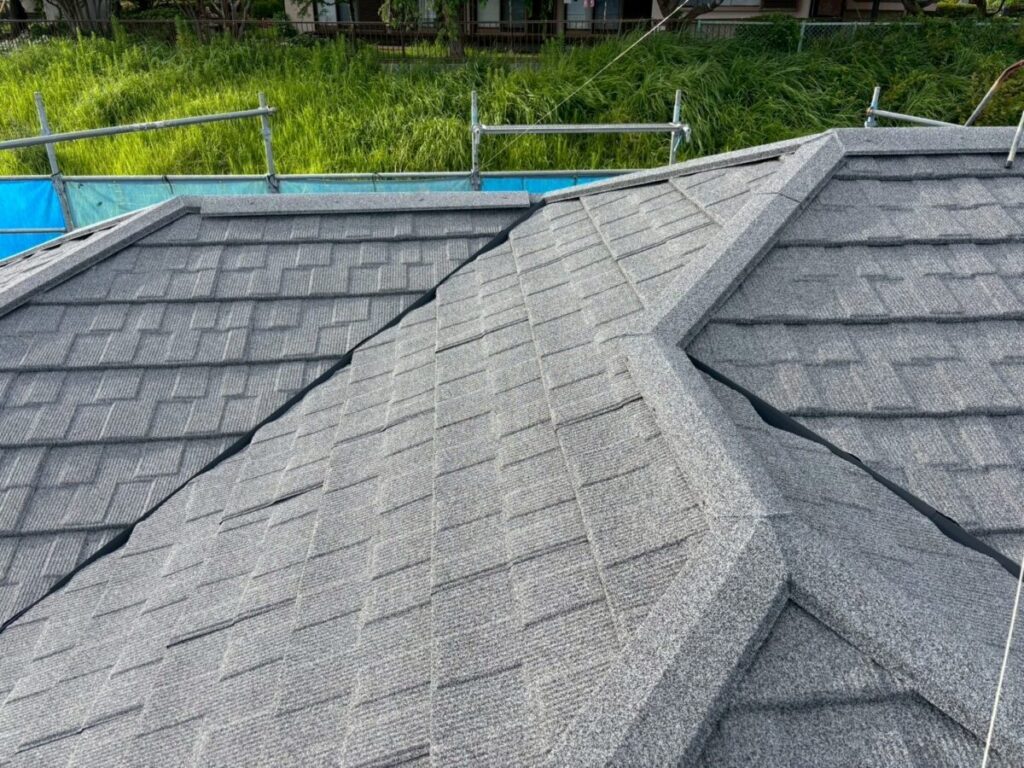 屋根診断のご依頼があり現地調査に伺いました。ドローンで屋根の現在の状態と屋根材の特定を行っていきます。既存の屋根材は旧クボタの「グリシェイドNEO」(現ケイミュー)の化粧スレート屋根材ででした。この屋根材はノンアスベストに切り替わった2001年〜2008年頃までの間に新築で施工されていたノンアスベスト屋根材で現在は廃盤となっている屋根材となります。強度を高めるためのアスベストが使用されなくなり耐久性の高い屋根材を作る技術が当時まだ低かっため、その頃のノンアスベストの屋根材は脆く割れやすいという特徴があります。現時点で数十枚の割れやカケが発生していました。以前他社様で塗装を実施されていましたが、多くのひび割れをコーキングで充填補修された跡がありました。塗装が不可のためカバー工法での重ね葺き工事のご提案させていただきました。