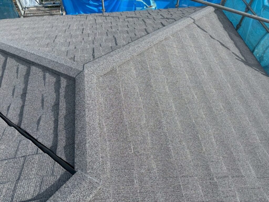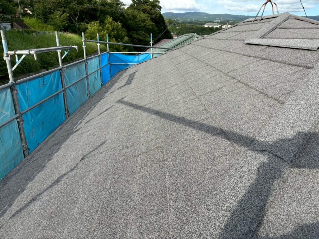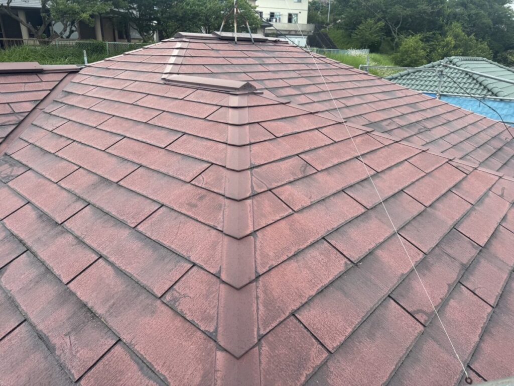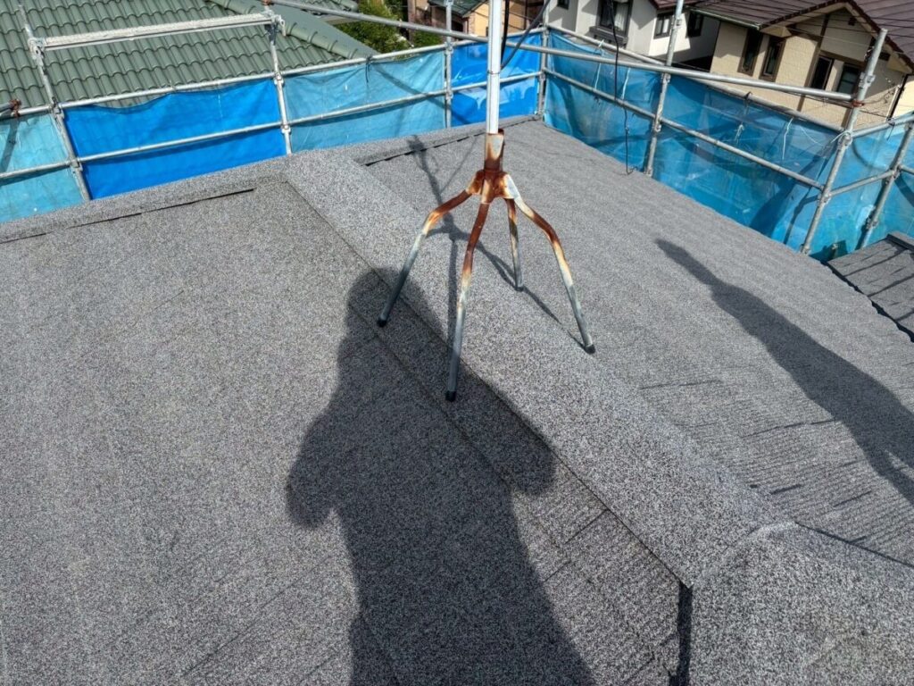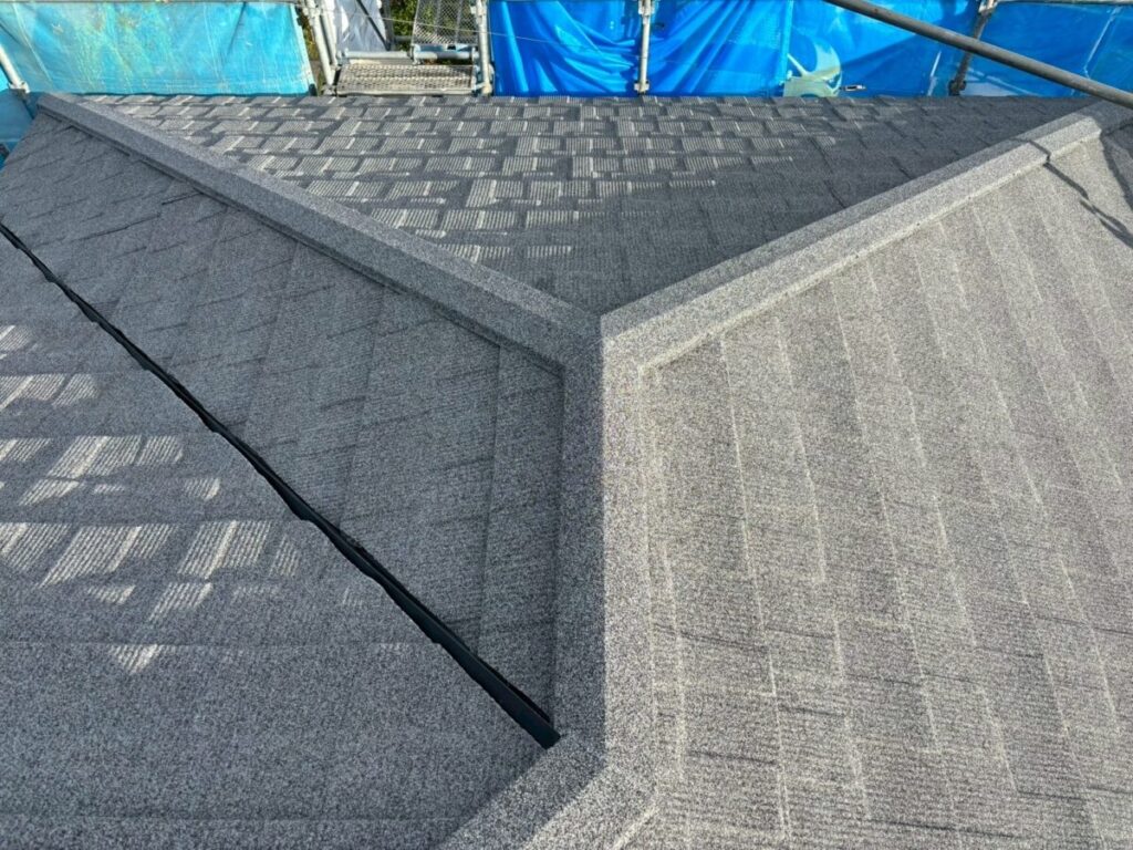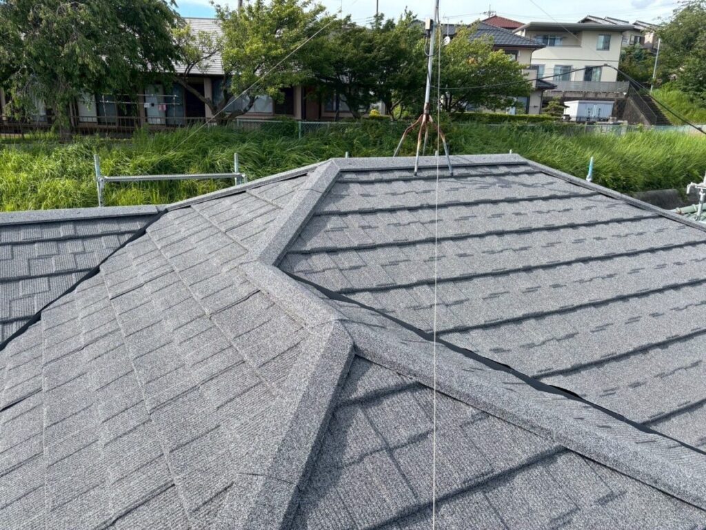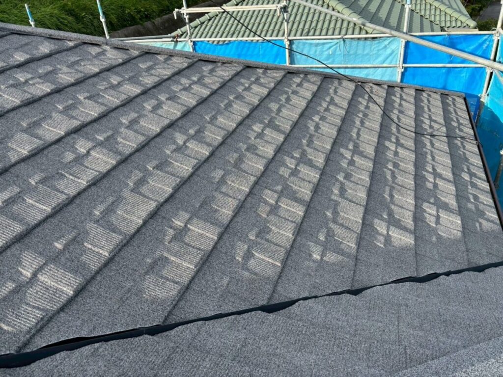 屋根診断のご依頼があり現地調査に伺いました。ドローンで屋根の現在の状態と屋根材の特定を行っていきます。既存の屋根材は旧クボタの「グリシェイドNEO」(現ケイミュー)の化粧スレート屋根材ででした。この屋根材はノンアスベストに切り替わった2001年〜2008年頃までの間に新築で施工されていたノンアスベスト屋根材で現在は廃盤となっている屋根材となります。強度を高めるためのアスベストが使用されなくなり耐久性の高い屋根材を作る技術が当時まだ低かっため、その頃のノンアスベストの屋根材は脆く割れやすいという特徴があります。現時点で数十枚の割れやカケが発生していました。以前他社様で塗装を実施されていましたが、多くのひび割れをコーキングで充填補修された跡がありました。塗装が不可のためカバー工法での重ね葺き工事のご提案させていただきました。