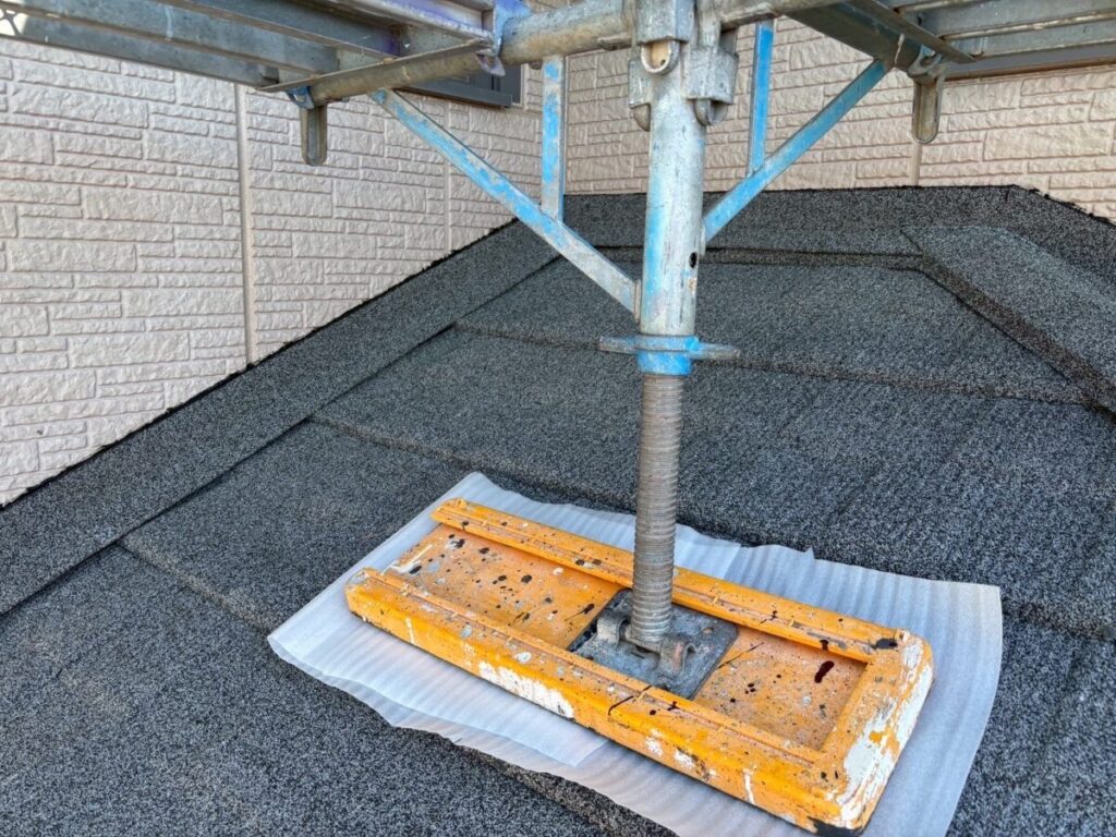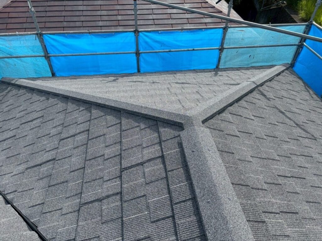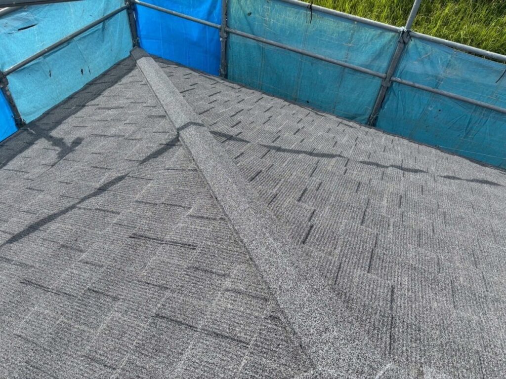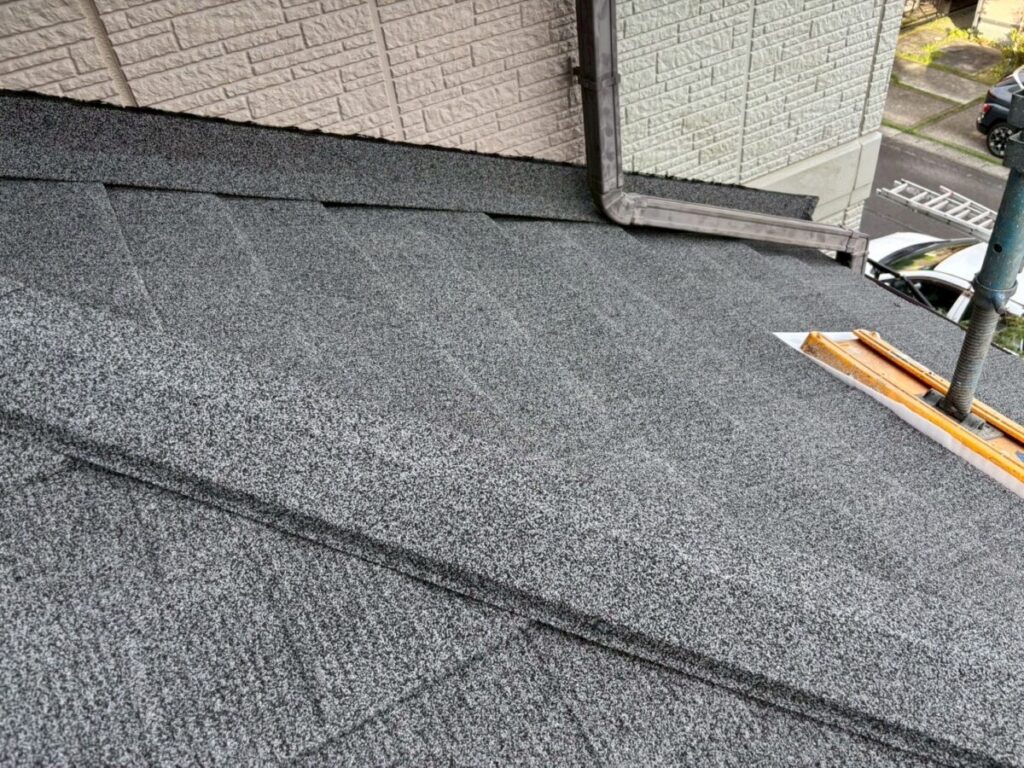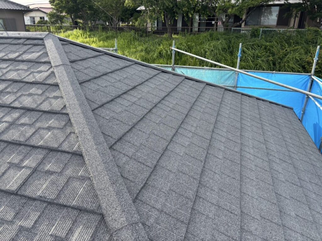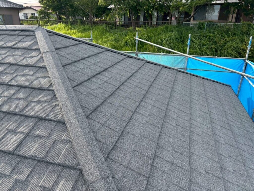 屋根診断のご依頼があり現地調査に伺いました。ドローンで屋根の現在の状態と屋根材の特定を行っていきます。既存の屋根材は旧クボタの「グリシェイドNEO」(現ケイミュー)の化粧スレート屋根材ででした。この屋根材はノンアスベストに切り替わった2001年〜2008年頃までの間に新築で施工されていたノンアスベスト屋根材で現在は廃盤となっている屋根材となります。強度を高めるためのアスベストが使用されなくなり耐久性の高い屋根材を作る技術が当時まだ低かっため、その頃のノンアスベストの屋根材は脆く割れやすいという特徴があります。現時点で数十枚の割れやカケが発生していました。以前他社様で塗装を実施されていましたが、多くのひび割れをコーキングで充填補修された跡がありました。塗装が不可のためカバー工法での重ね葺き工事のご提案させていただきました。