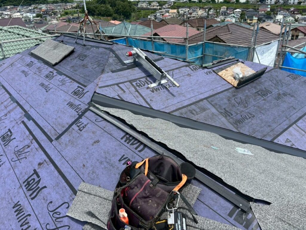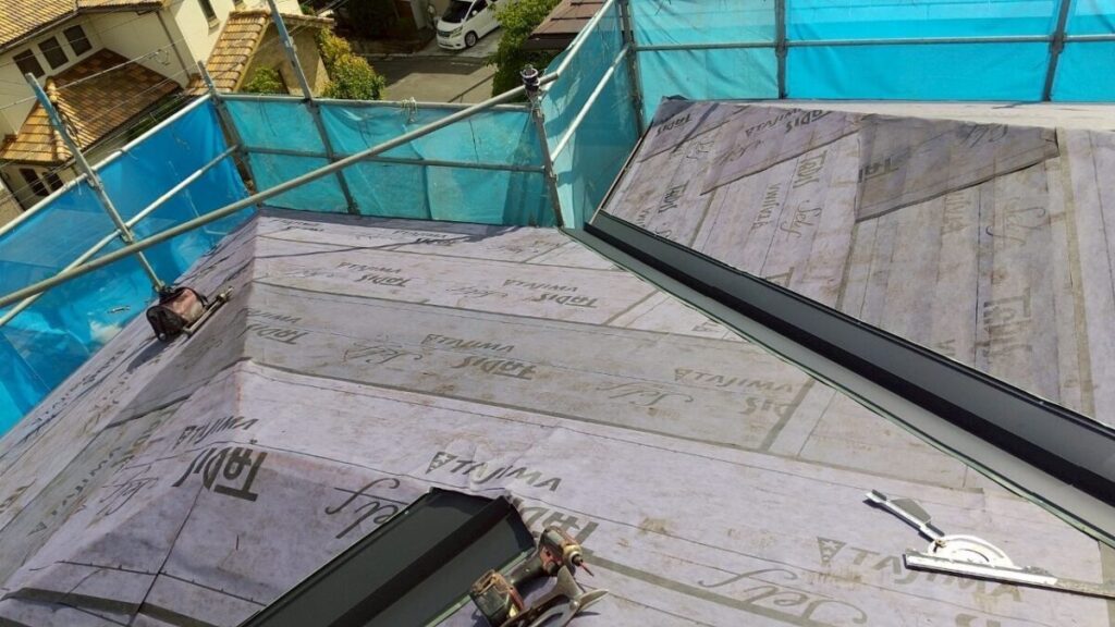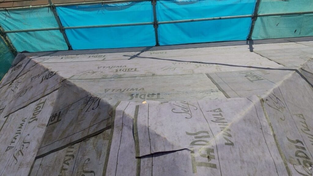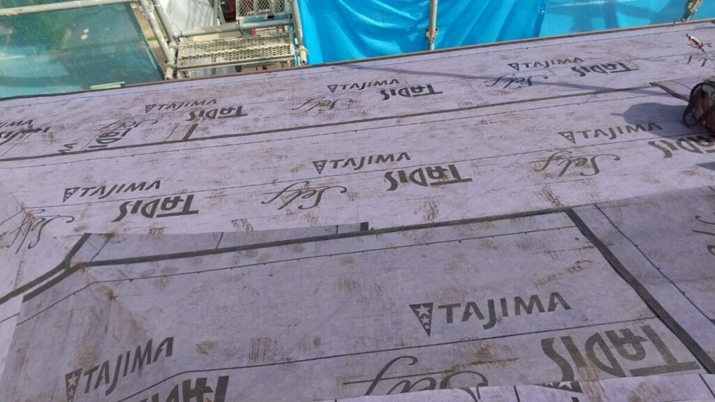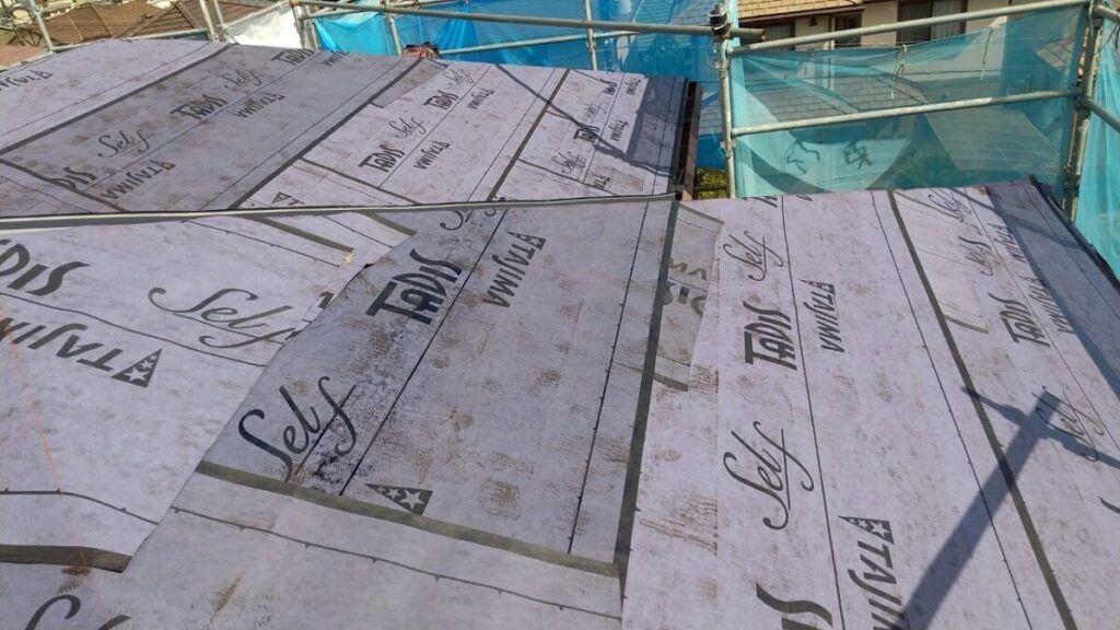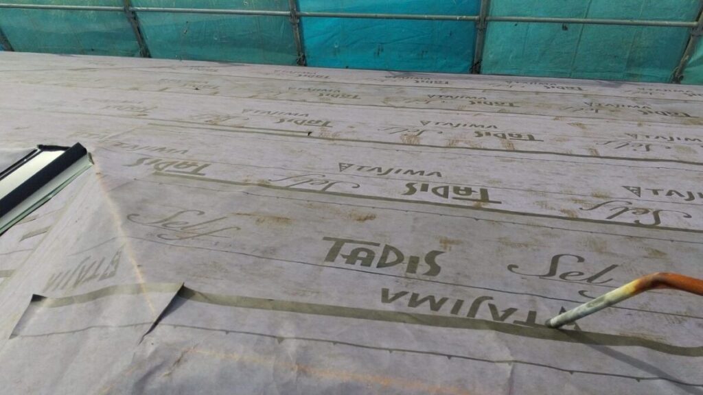 棟の板金を撤去し軒先に水切り板金を取り付けたら粘着層の付いた改質アスファルトルーフィング(防水シート)下から上に向かって順に張っていきます。