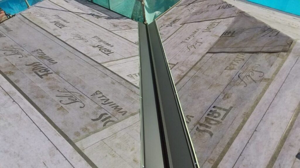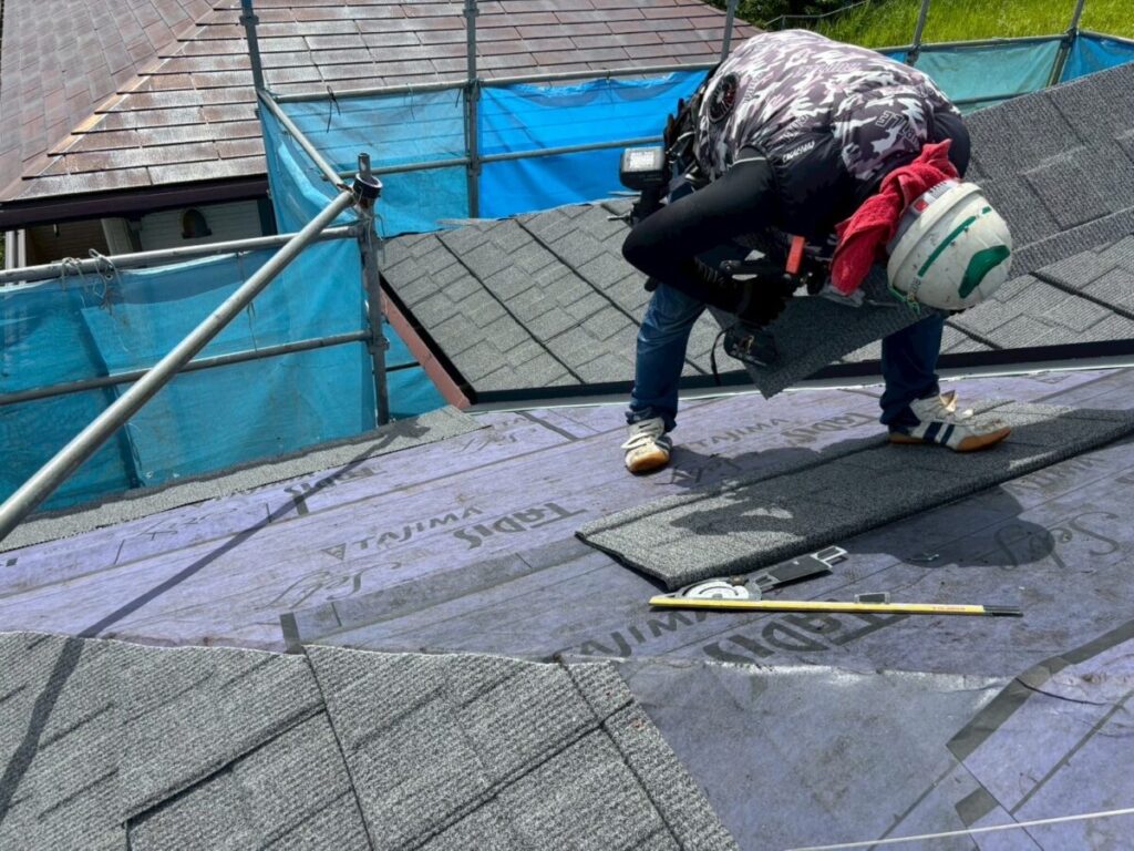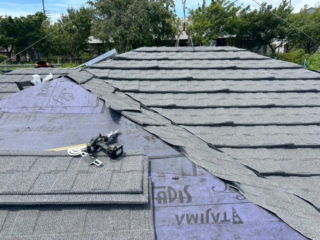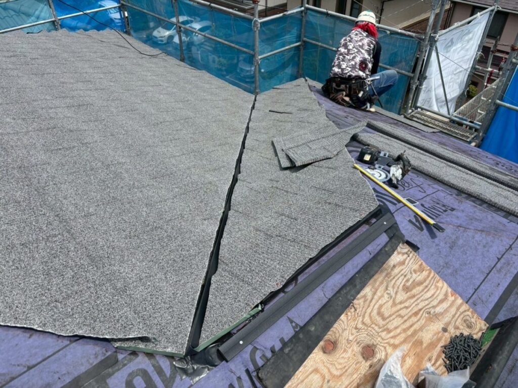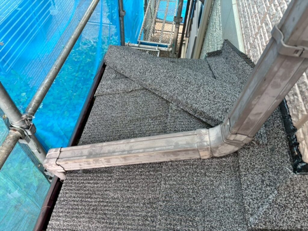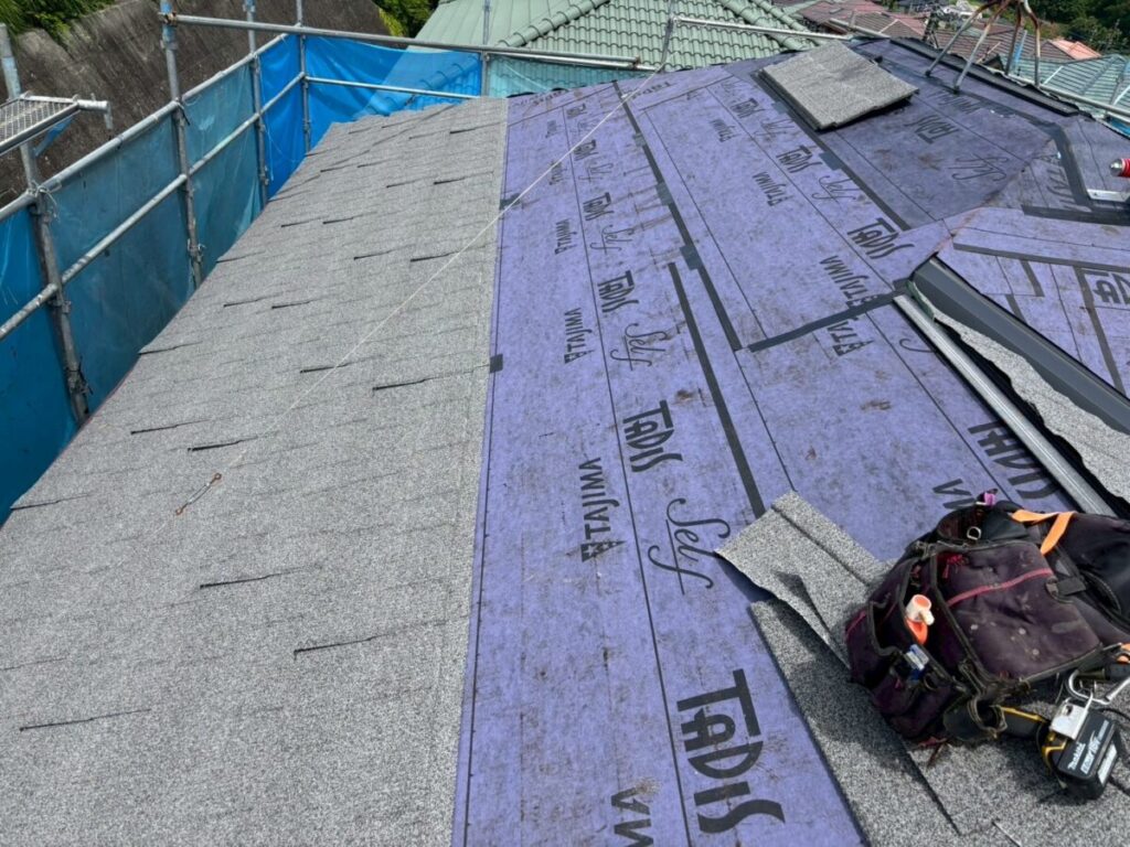 棟の板金を撤去し軒先に水切り板金を取り付けたら粘着層の付いた改質アスファルトルーフィング(防水シート)下から上に向かって順に張っていきます。