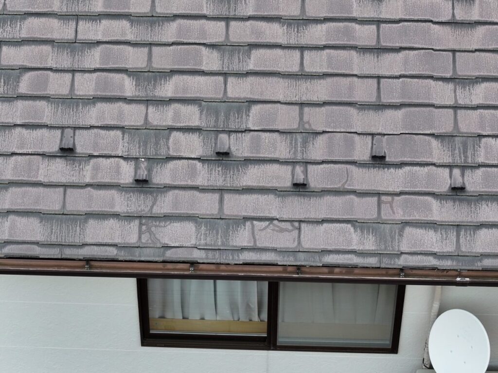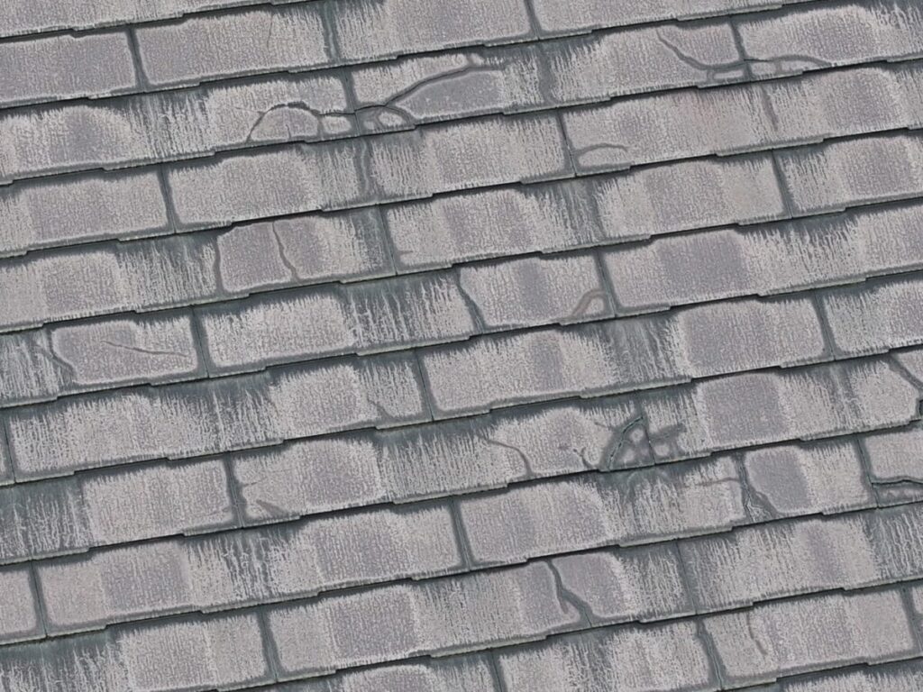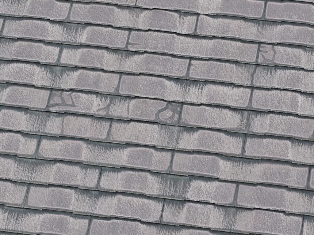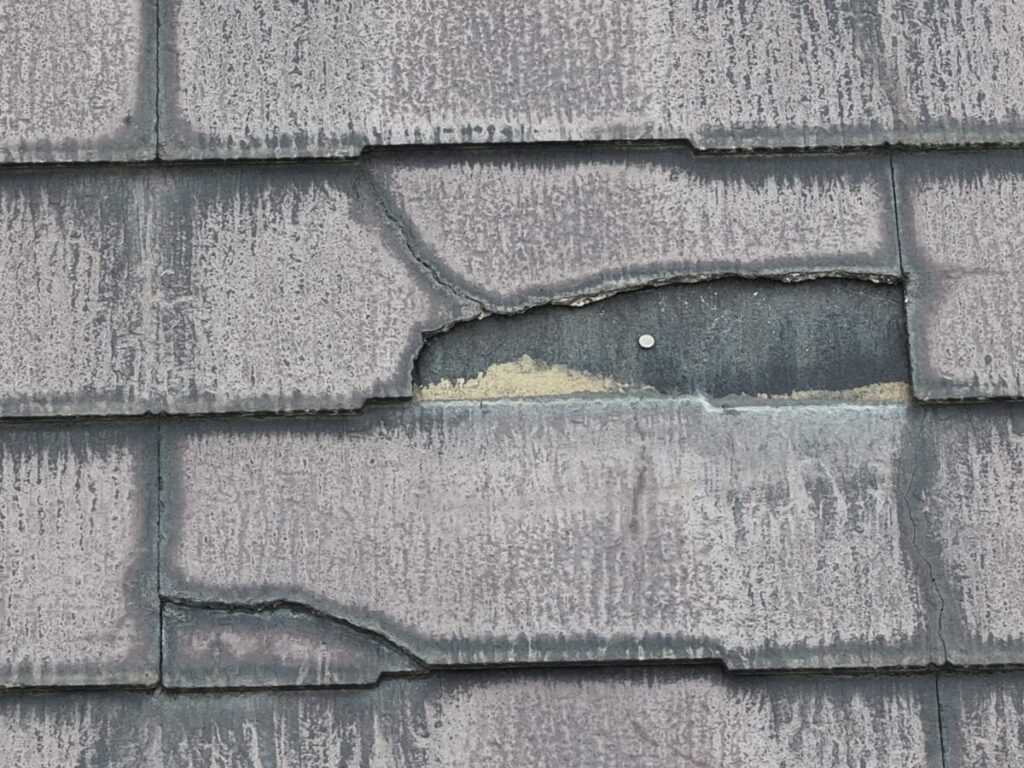 急にそれが使えなくなり、代わりの素材で作ったのがこのコロニアルNEOです。ただ、移行したばかりの時期の製品だったため、正直なところ強度が弱かったと言われています。実際の現場でも、・経年でひび割れが増える・表面がボロボロと欠ける・層のようにめくれる・屋根に上がると踏み割れてしまうこういった症状が多く見られます。特に厄介なのが「踏み割れ」です。普通のスレートなら気をつければ歩けますが、この屋根材は慎重に歩いても割れることがあります。なので点検や部分補修が難しい屋根材でもあります。築15年〜20年を過ぎたあたりから一気に割れが増える印象があります。塗装でどうにかなる屋根材ではなく、根本的な改修を考えるケースがほとんどです。見た目がまだ大丈夫そうでも、中身が弱くなっていることが多い屋根材です。同じコロニアルNEOが載っているお宅は、一度点検しておくと安心だと思います。