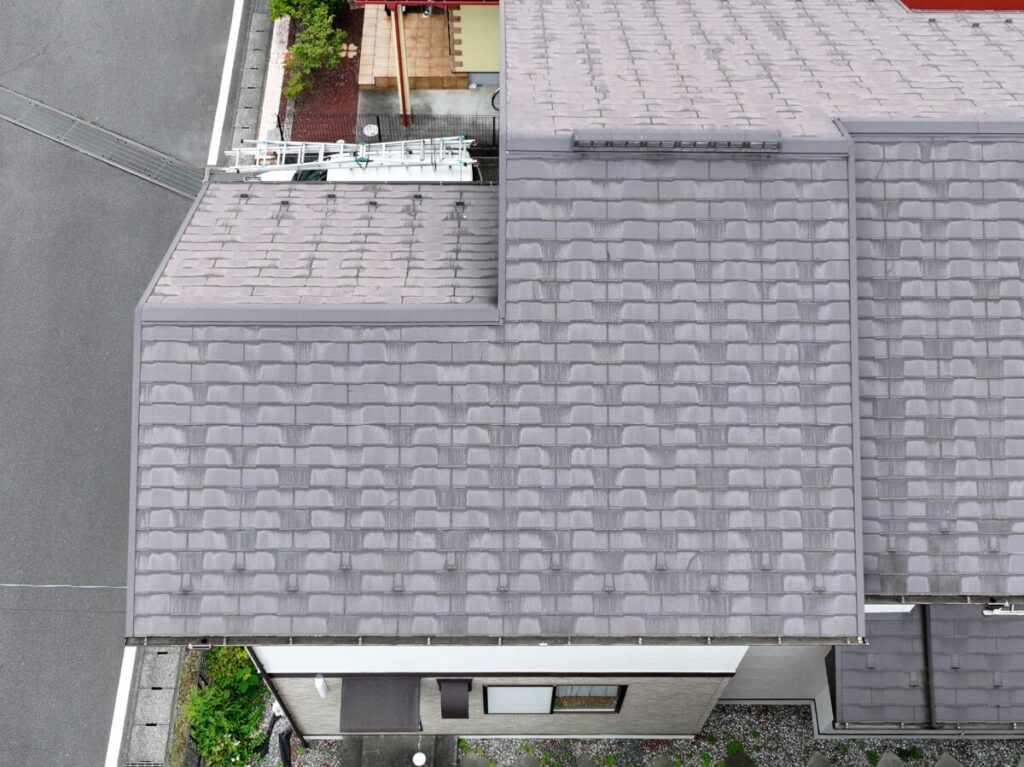 静岡県三島市にて、折込みチラシを見ていただいたお施主様から「屋根から破片が落ちてきた」とお問い合わせをいただきました。現地へ伺うと、「雨漏りはしていないが屋根材の状態が気になる」とのことでしたので早速ドローンで屋根全体の点検をしていきました。既存の屋根材は 「コロニアルNEO」今はもう廃盤になっている、初期のノンアスベスト屋根材です。この屋根材は正直なところ、あまり良い評判はありません。アスベストが使えなくなった頃に出た製品で、強度が弱く、年数が経つと割れや欠けが目立ってきます。特に厄介なのが、屋根に上がると踏み割れを起こすことです。職人が慎重に歩いても、パキッと割れてしまうことがあります。そのため、上がっての部分補修が難しく塗装も不可の屋根材でもあります。今回の屋根も、割れや欠けが50箇所以上、一部はすでに破片が落下、という状態でした。今は雨漏りしていませんが、月日と共に防水シートの劣化もしていきますが、割れたままで放置するとさらに劣化を早めてしまい、いずれ雨漏りにつながる可能性があります。部分的に直しても、また別の場所が割れる可能性が高いため、今回は金属製の軽い屋根材シルキーG2を使用したカバー工法でのご提案をさせていただきました。