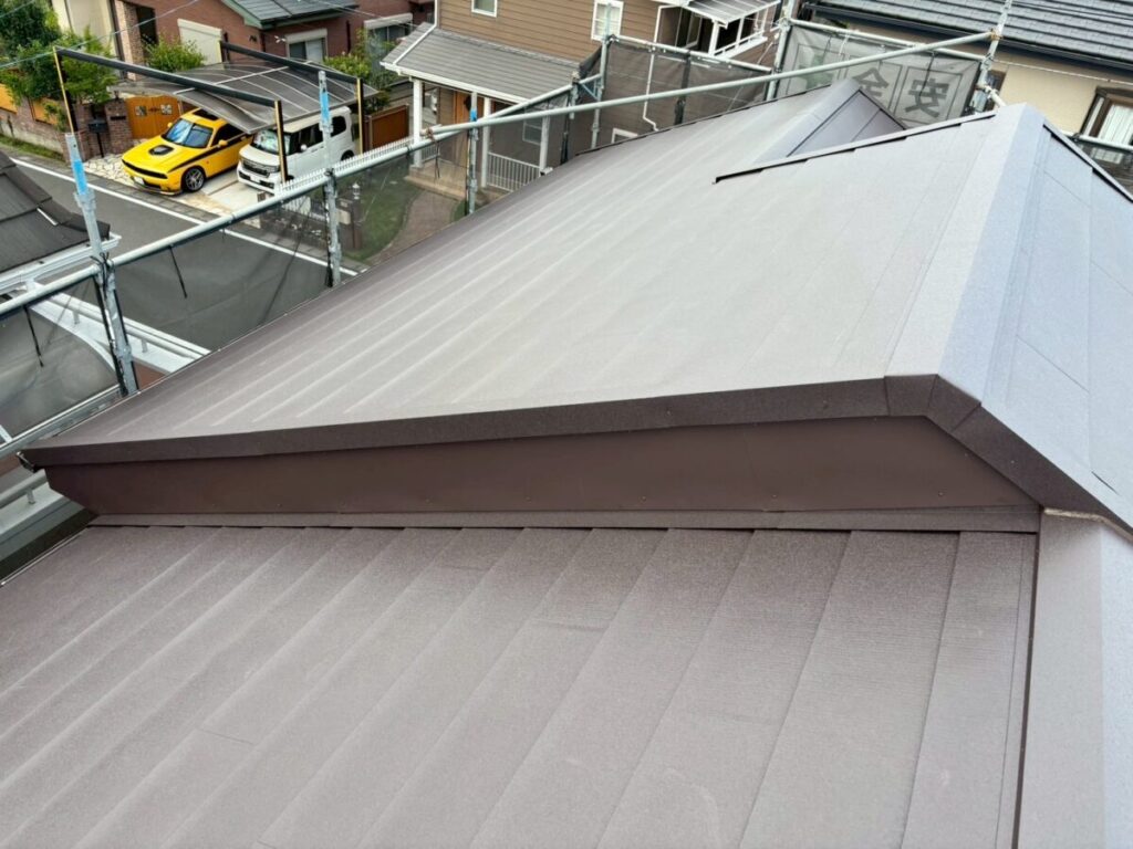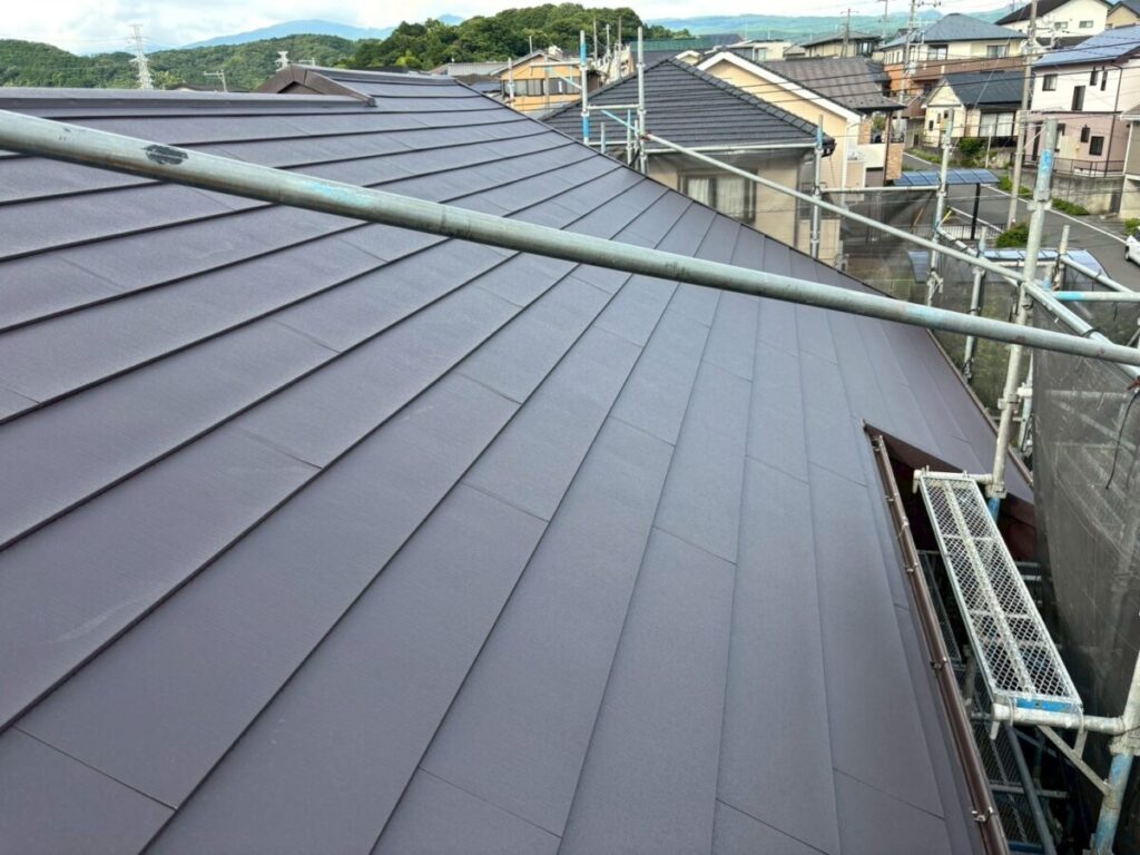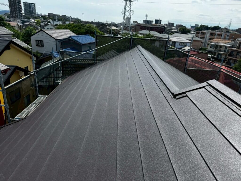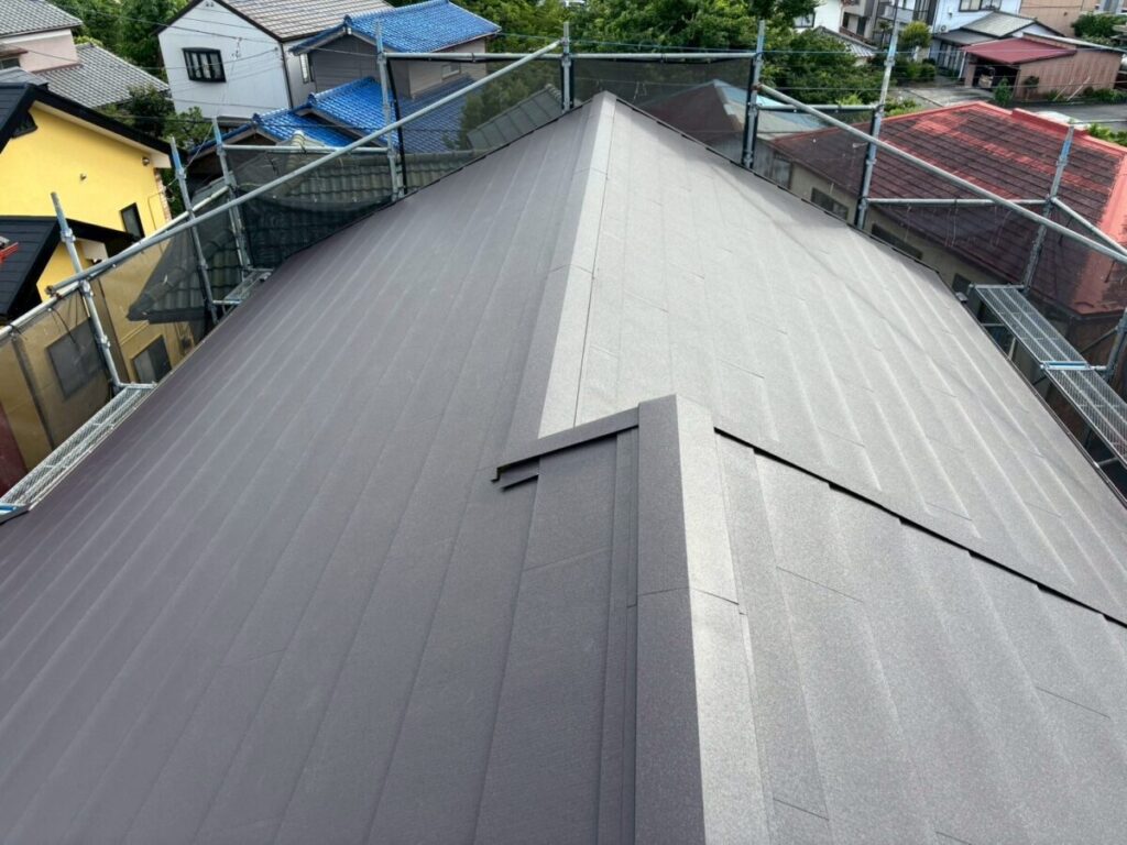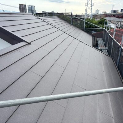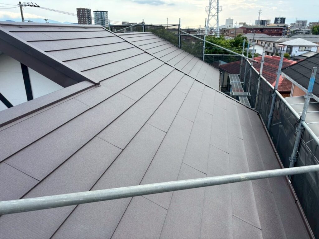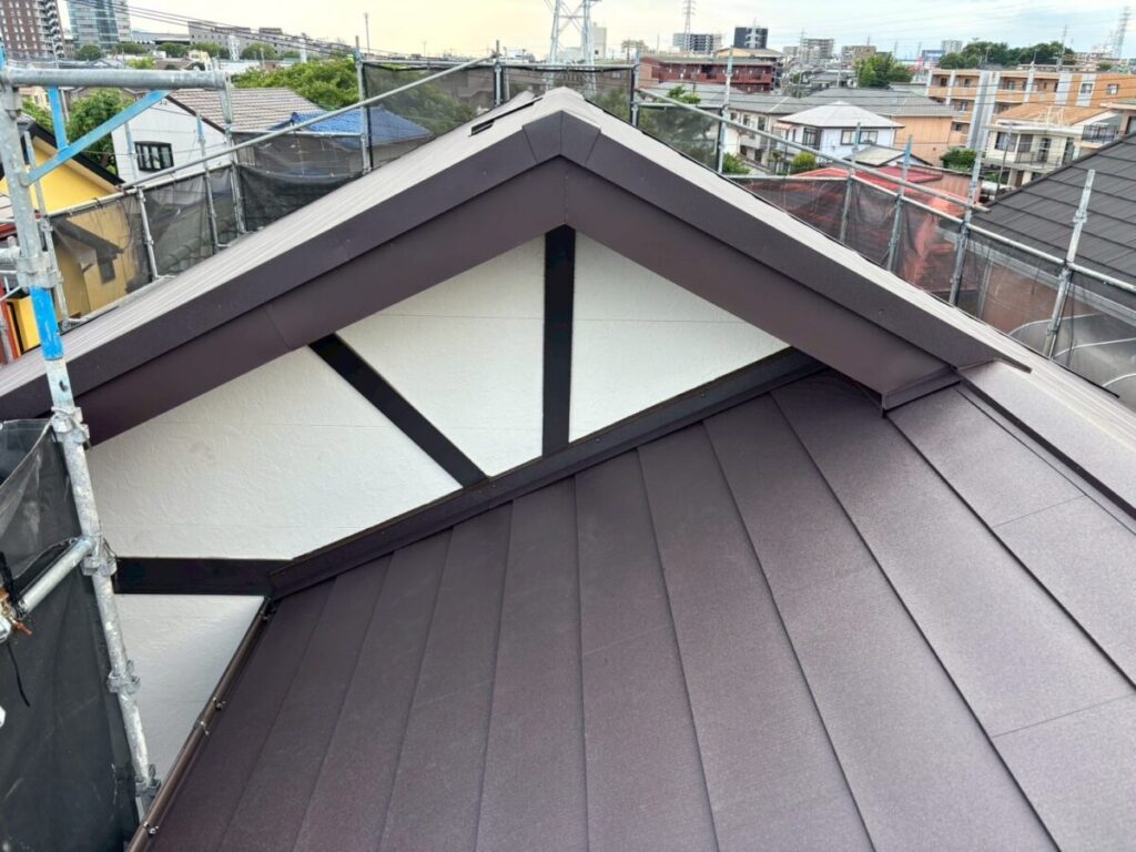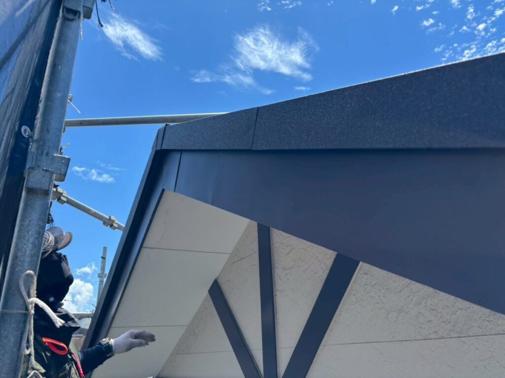 破風板も塗膜が剥がれていましたので板金を巻かせていただきました。無事に屋根工事が完成しました。今回使用した色はダークブラウンで、表面はちぢみ塗装がされているので落ち着いた質感に仕上がります。これで雨や台風の心配もなく、長く安心してお住まいいただけます。