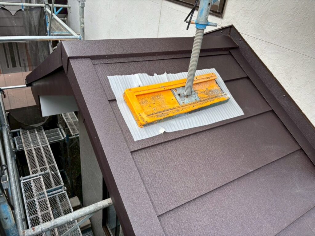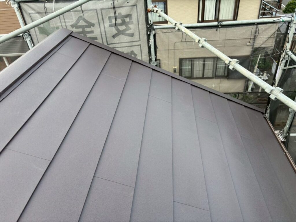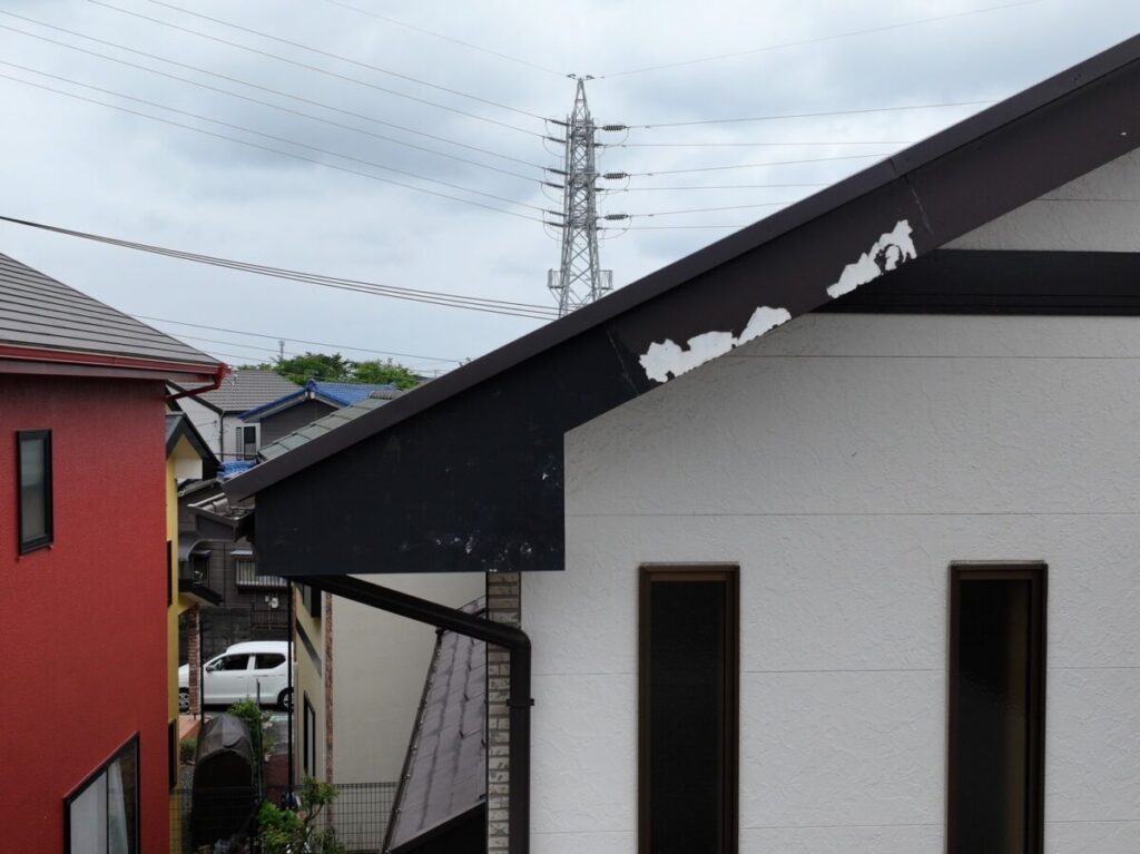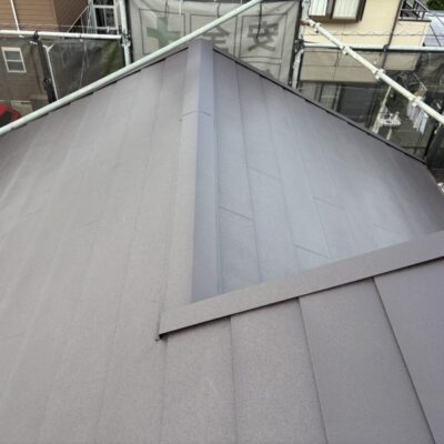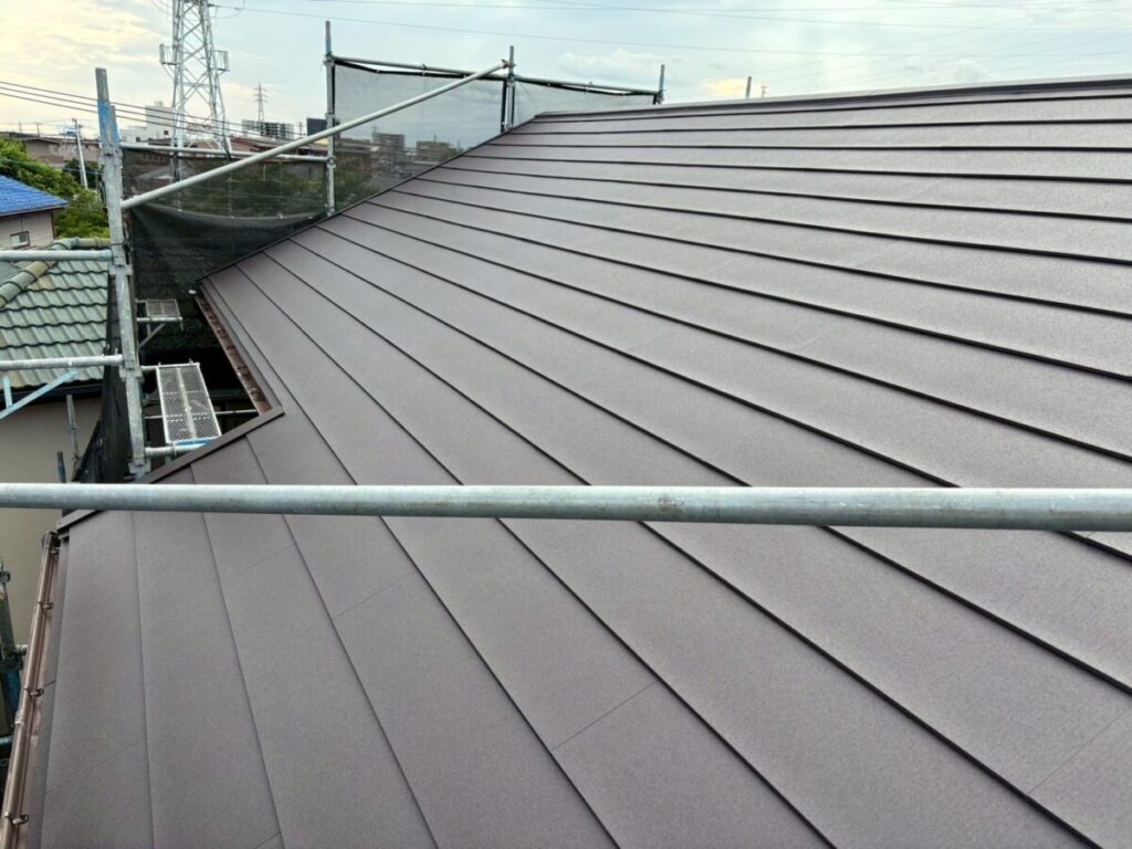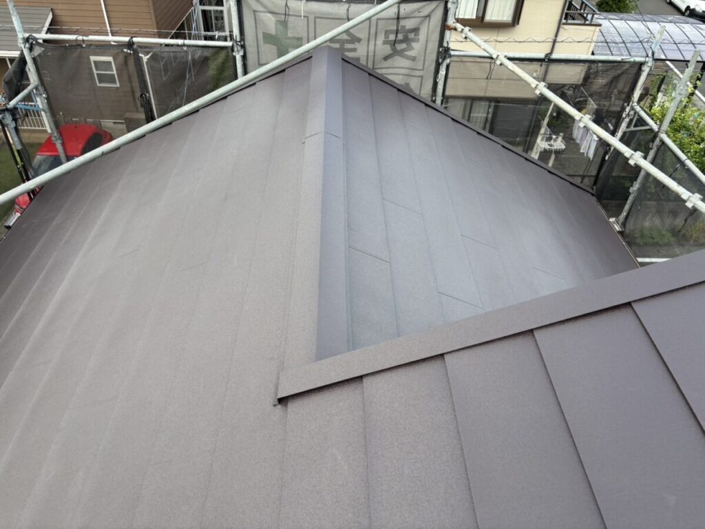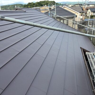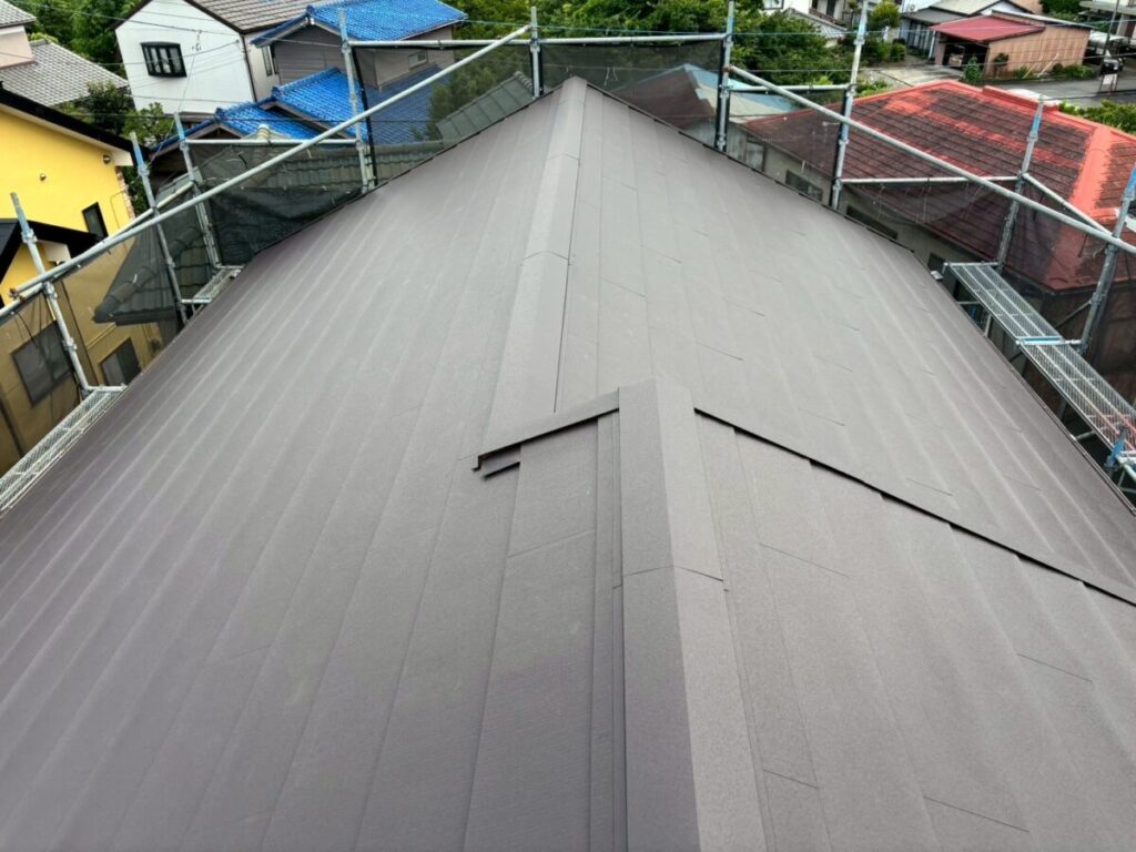 破風板も塗膜が剥がれていましたので板金を巻かせていただきました。無事に屋根工事が完成しました。今回使用した色はダークブラウンで、表面はちぢみ塗装がされているので落ち着いた質感に仕上がります。これで雨や台風の心配もなく、長く安心してお住まいいただけます。