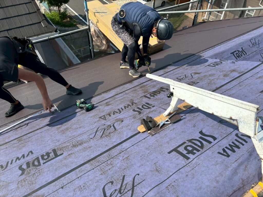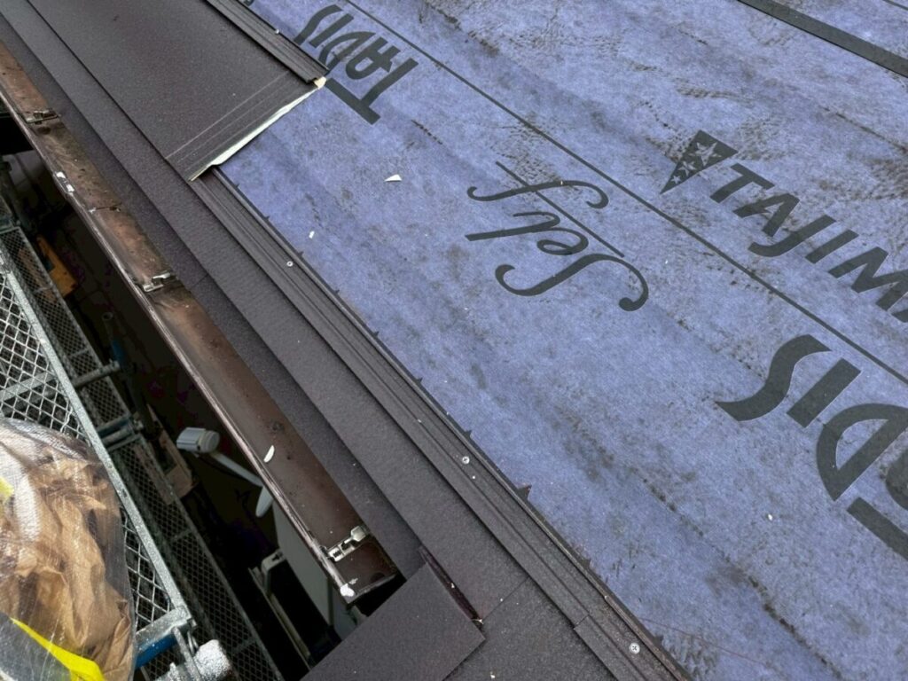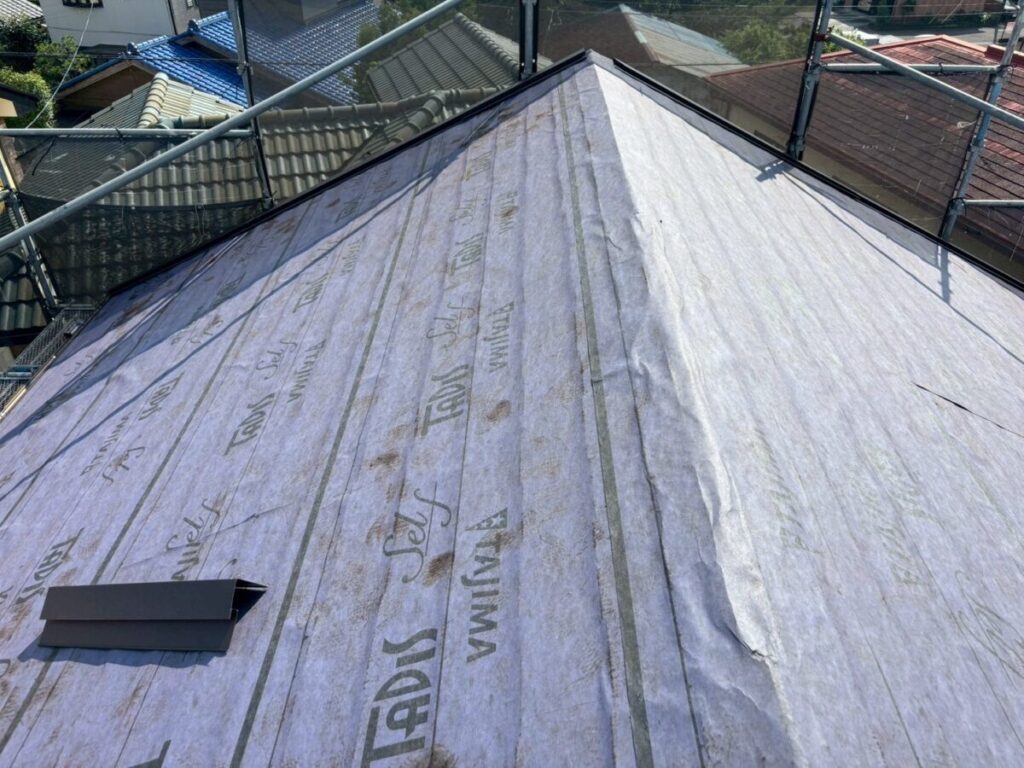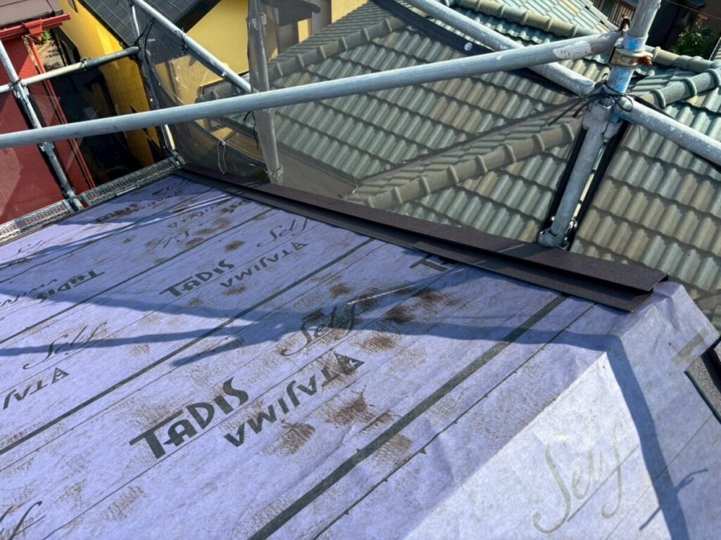初めに既存の棟板金、棟下地を撤去していきます。軒先には役物板金の軒先水切りを取り付けていきます。今回は雨樋をそのまま使用しますので軒先水切りにセットバックを使用しました。屋根全面にルーフィングタディスセルフ(防水シート)を全面的に張っていきます。