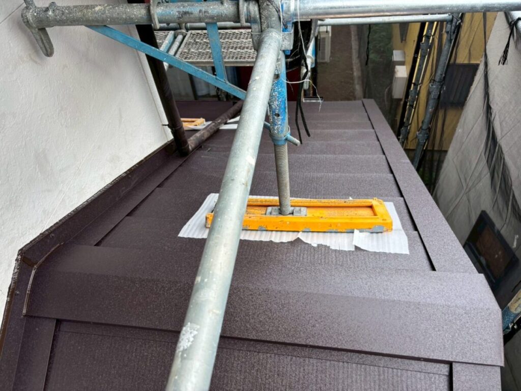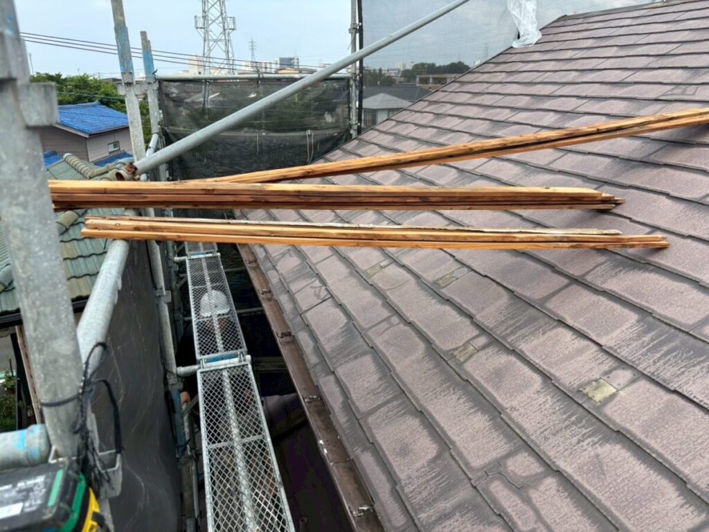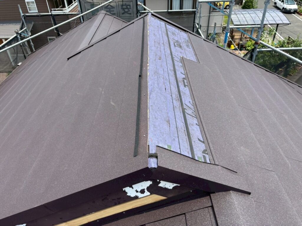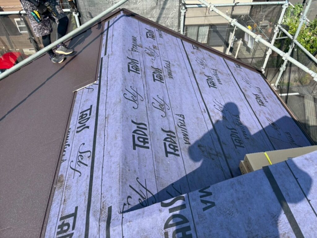 初めに既存の棟板金、棟下地を撤去していきます。軒先には役物板金の軒先水切りを取り付けていきます。今回は雨樋をそのまま使用しますので軒先水切りにセットバックを使用しました。屋根全面にルーフィングタディスセルフ(防水シート)を全面的に張っていきます。