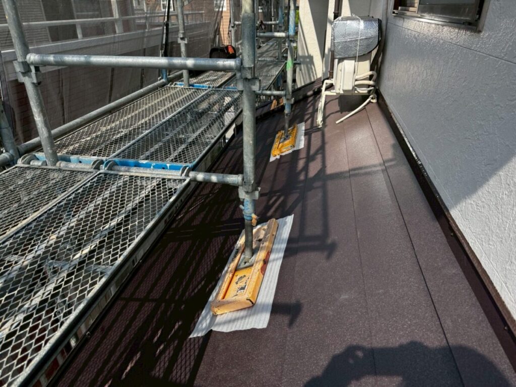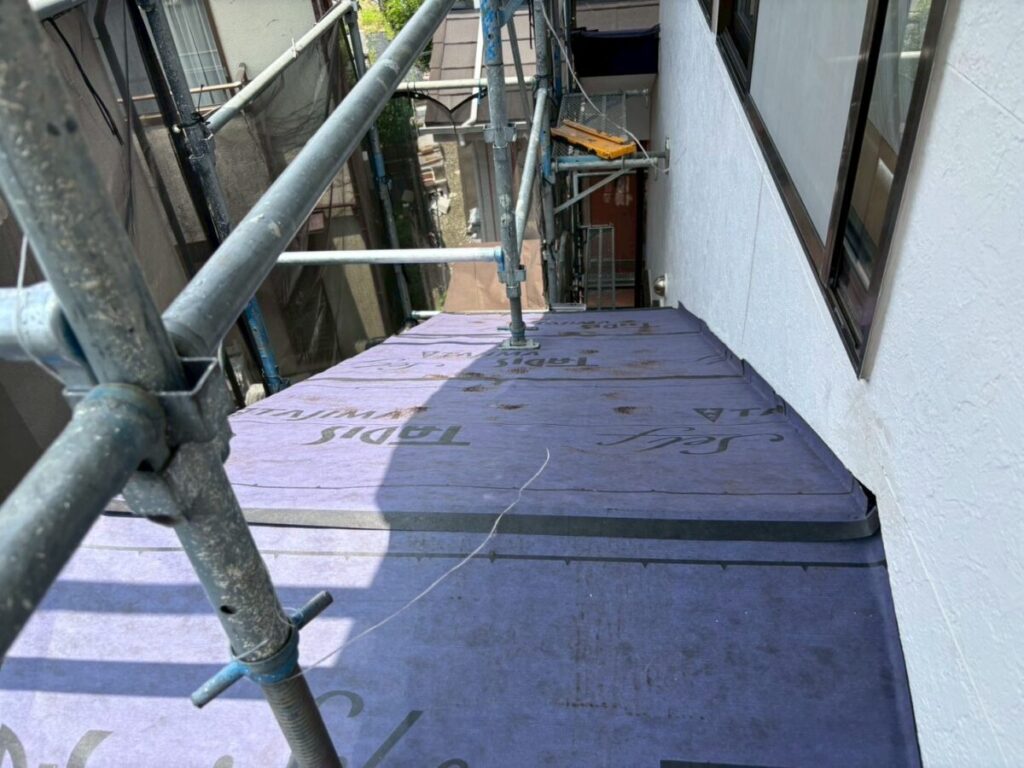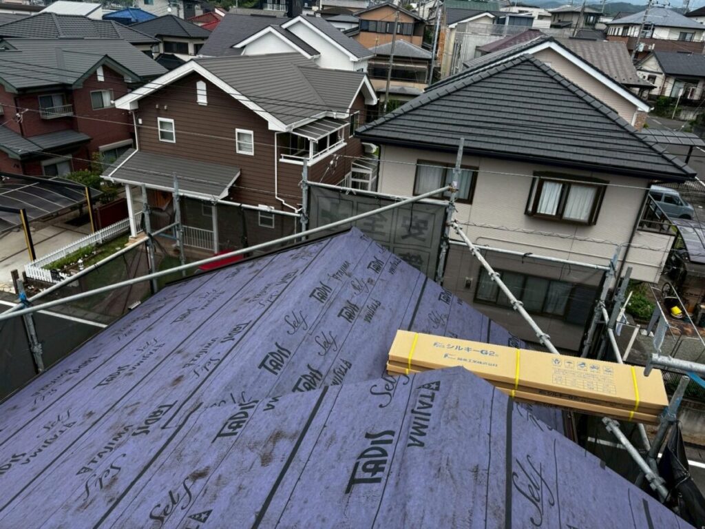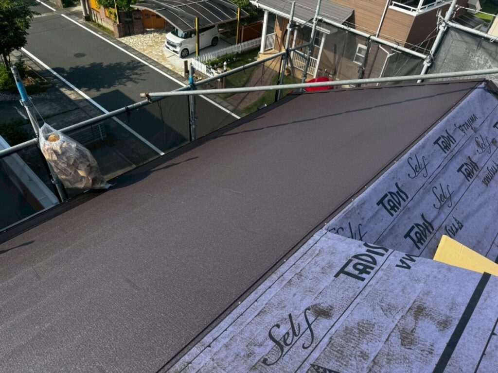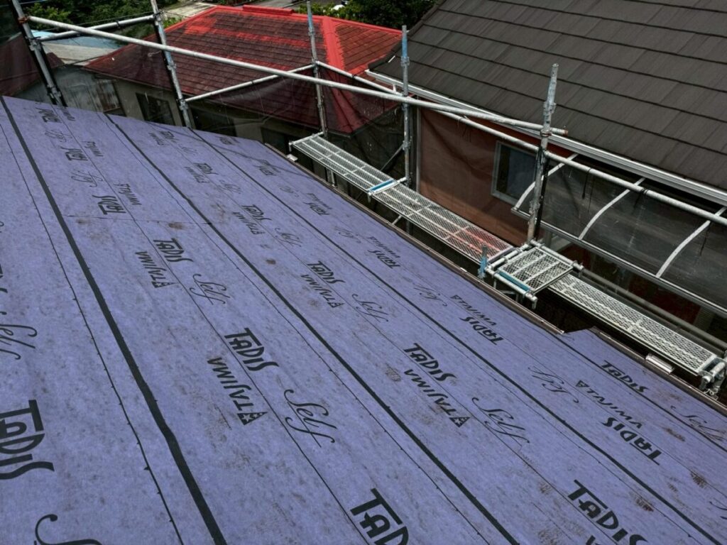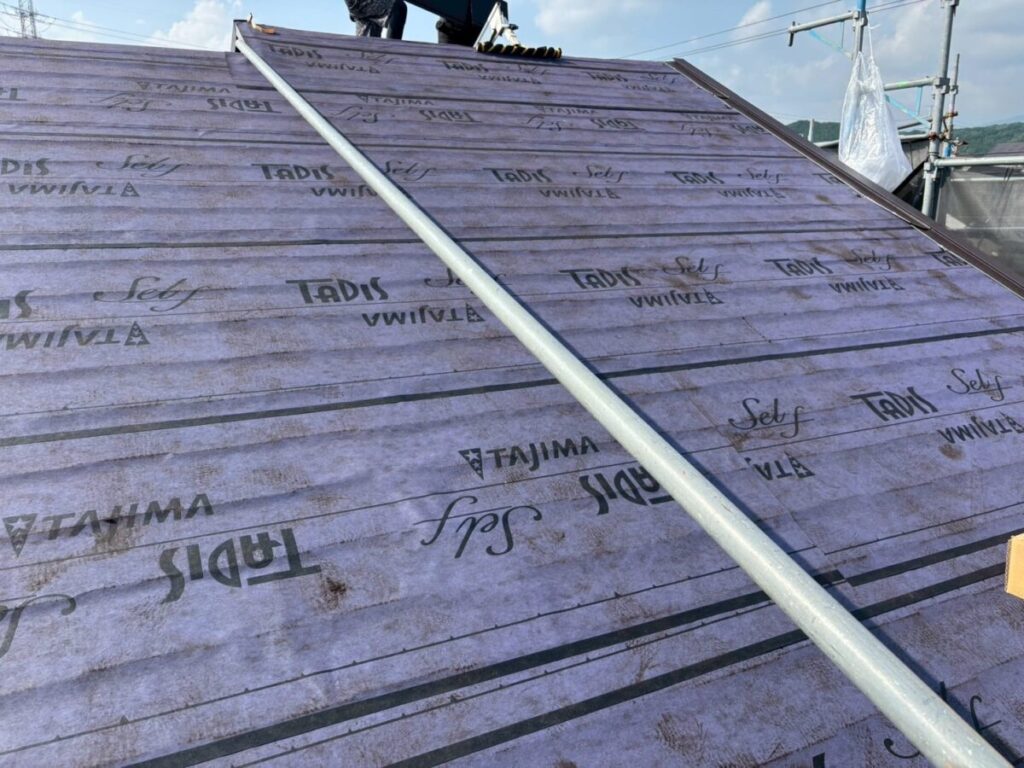 田島ルーフィングのタディスセルフは、粘着層がついた改質アスファルトルーフィングです。簡単に言うと、雨水から家を守るための“防水シート”です。この材料の良いところは釘穴まわりの密着性です。屋根材を固定するためにどうしても釘やビスを打ちますが、その部分にしっかり密着して水の侵入を抑えてくれます。見えない部分ですが、ここがしっかりしていないと雨漏りにつながります。通常のルーフィングよりもグレードが高いので、長持ちさせたい現場や、雨漏りが心配な屋根には特におすすめです。カバー工法との相性も良く、ガルバリウム鋼板の屋根にもよく使われています。屋根材は完成すると見えますが、下葺き材は隠れてしまいます。ただ、実際に家を守っているのはこの下葺き部分です。長く安心して住んでもらうために、こういった材料選びも大事にしています。