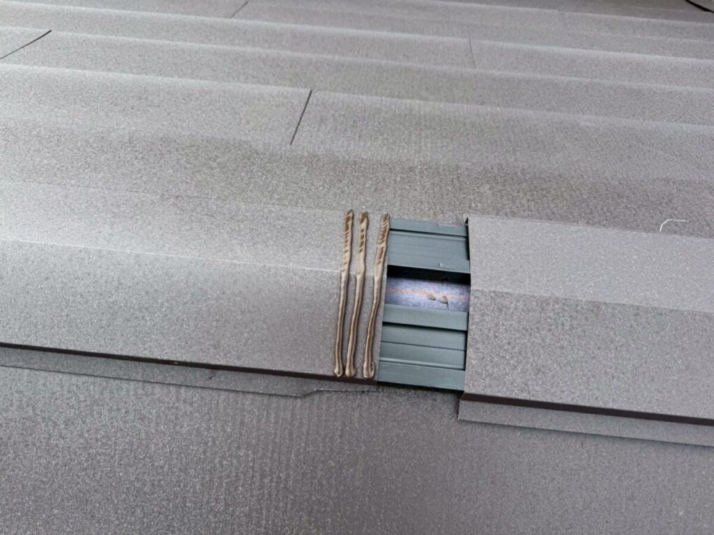 本体の板をしっかりとビスで留めていきます。本体の張り合わせ部分に止水材のエプトシーラーを貼りその上に棟下地の樹脂製木材タフモックをのせビスで留めていきます。最後に棟板金を被せたら完成です。棟板金のジョイント部分にはしっかりと捨てシーリングを充填してから棟同士を被せます。