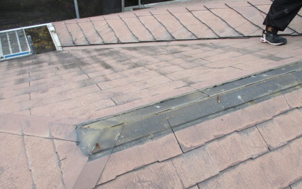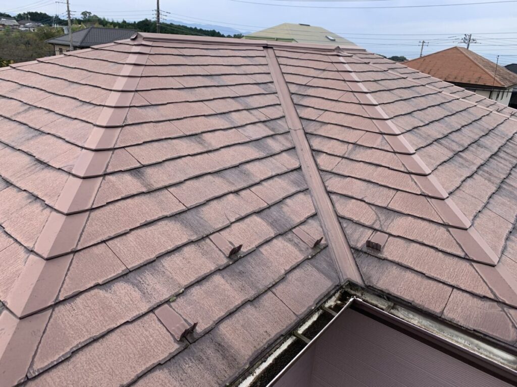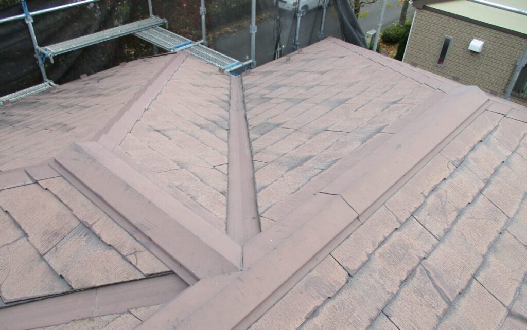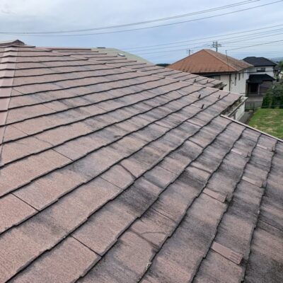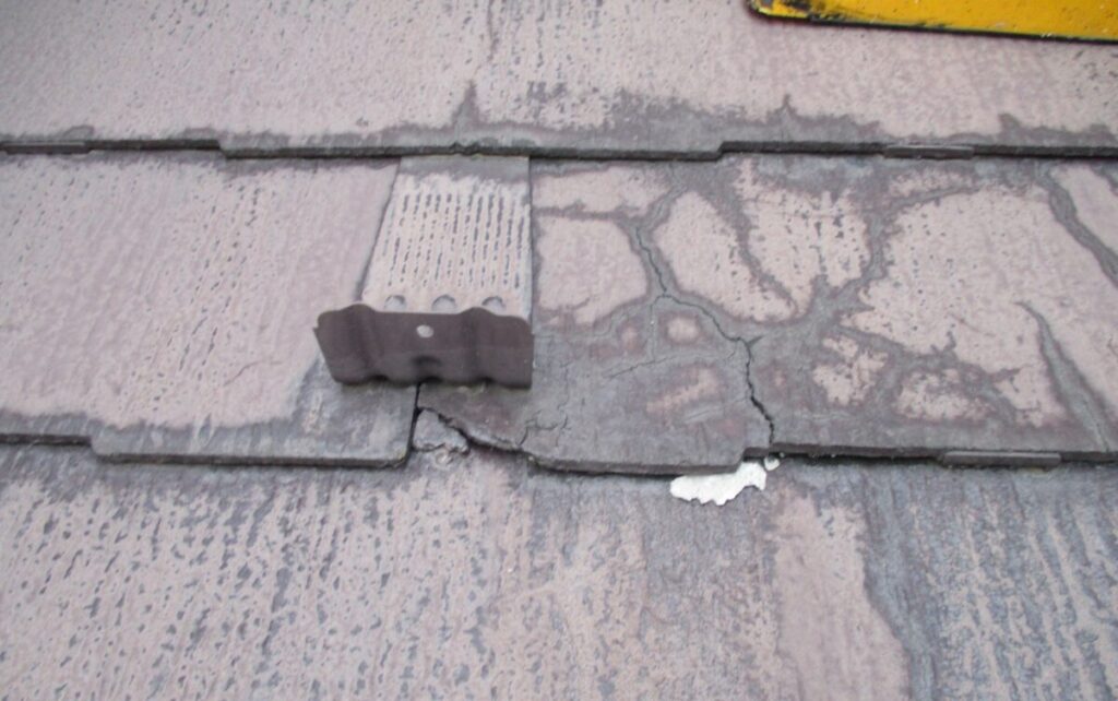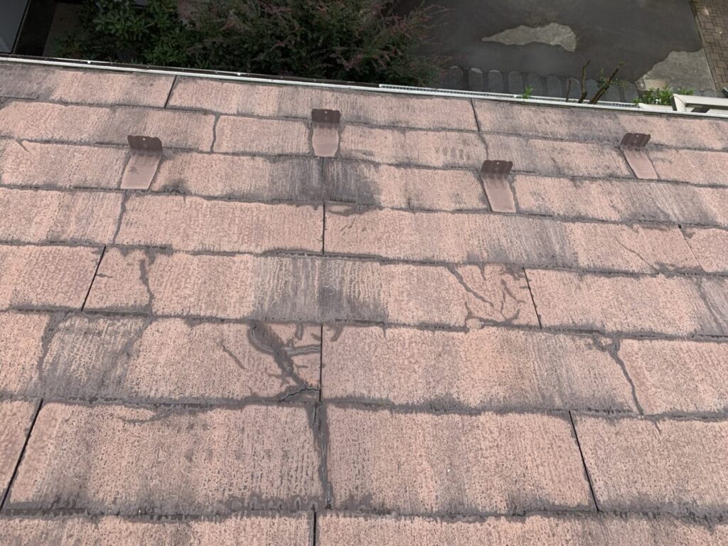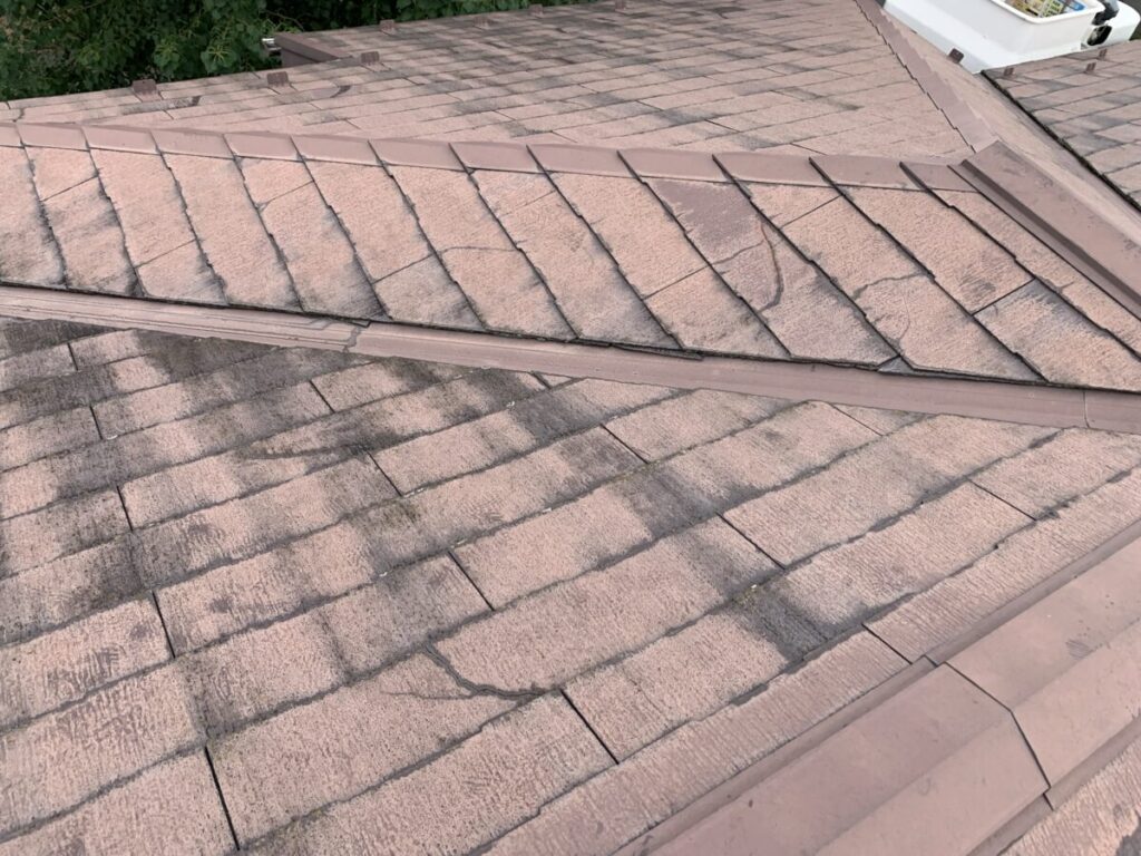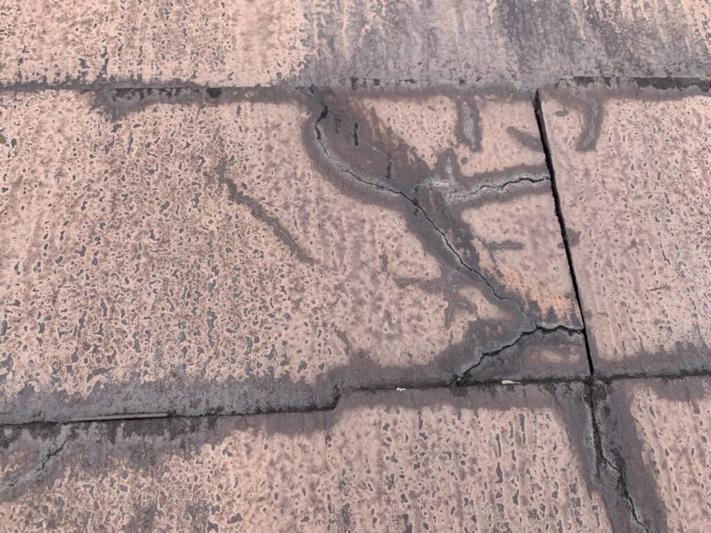 「屋根材の破片が落ちてくるので心配」とのご相談をいただき、屋根診断のため現地調査に伺いました。実際に屋根へ上がって確認していくと、屋根材は コロニアルNEO(クボタ/現ケイミュー製)。2001年~2008年頃まで採用されたスレート屋根材ですが、現在は廃盤となっている製品です。コロニアルNEOは、アスベスト規制後の「ノンアスベスト初期世代」の屋根材に分類され、当時は軽量で施工性に優れる一方、経年劣化による脆さ(割れ・欠け・層間剥離)が発生しやすいという特徴があります。今回の屋根も、実際に50箇所以上のひび割れや欠損が確認できました。このタイプの屋根材は 塗装すればするほど基材が傷み割れや破損が悪化する傾向にあります。塗装はあくまで美観の向上が目的で塗っても割れや崩れを止めることはできません。今回は、既存屋根を撤去せずに上から新しい屋根材を施工する カバー工法(重ね葺き) をご提案しました。採用する屋根材は セネター(天然石粒付ガルバリウム鋼板屋根材) です。
