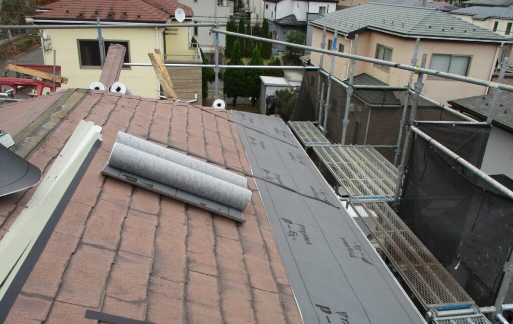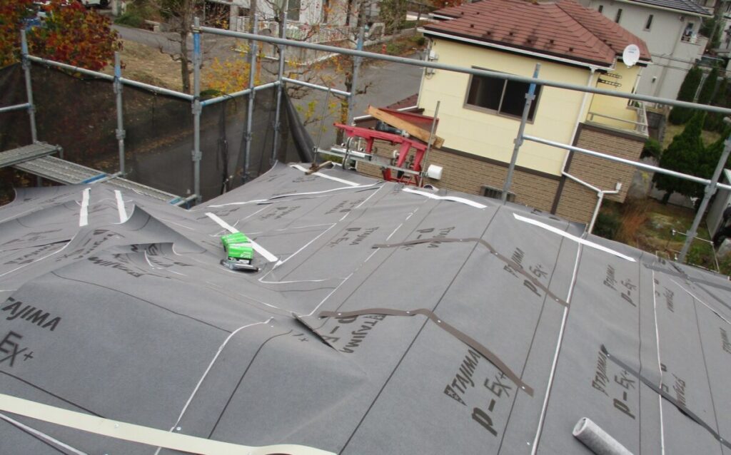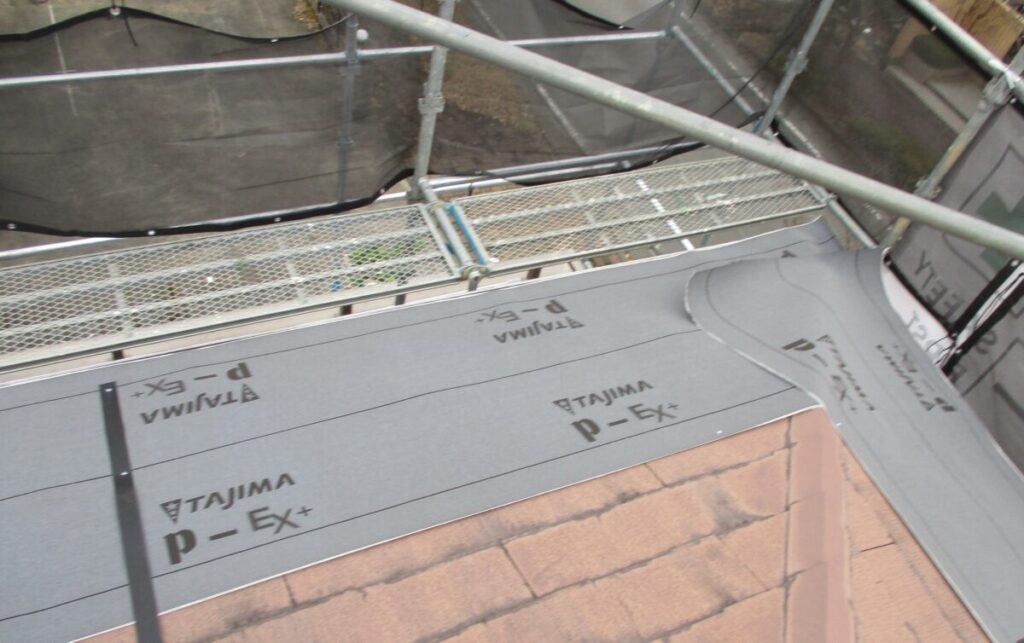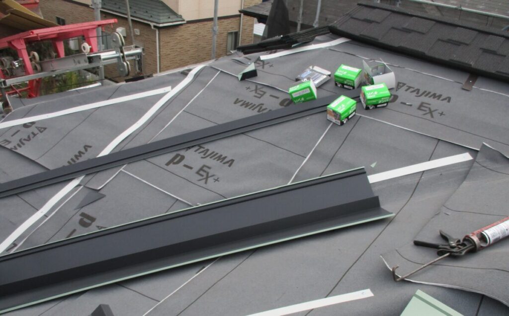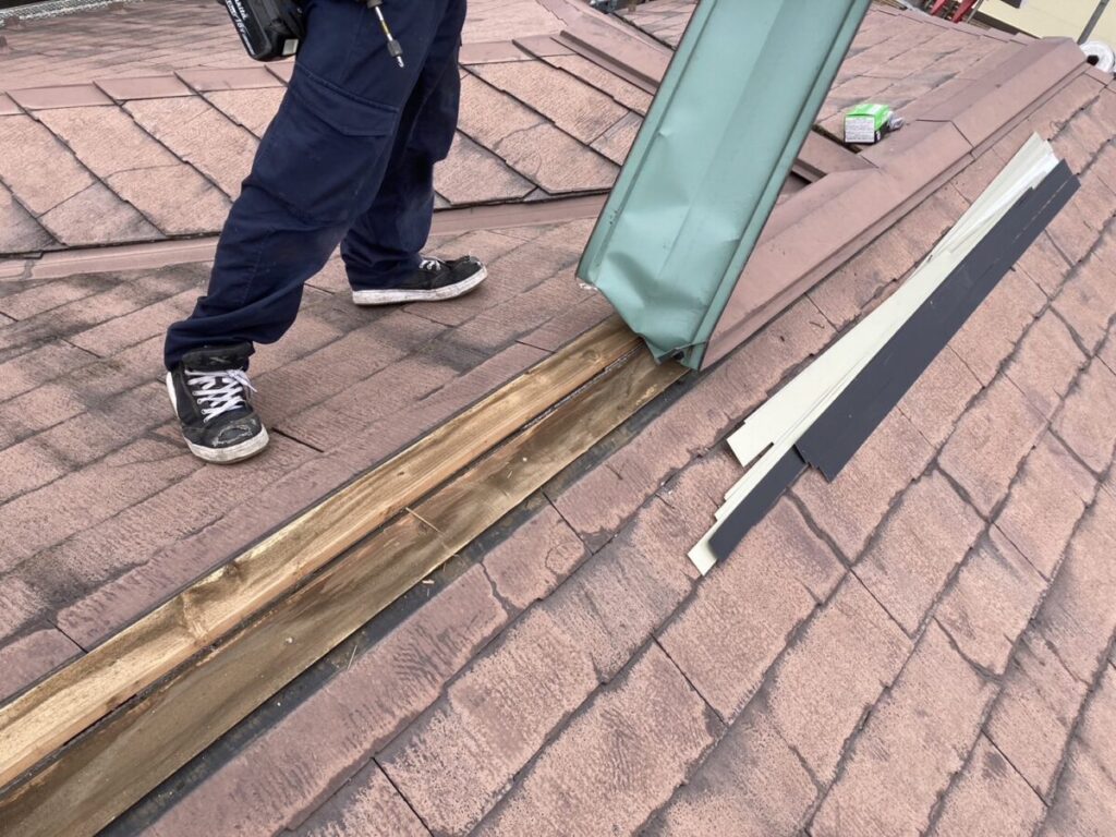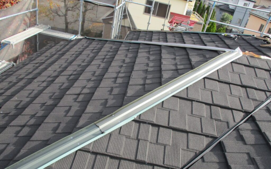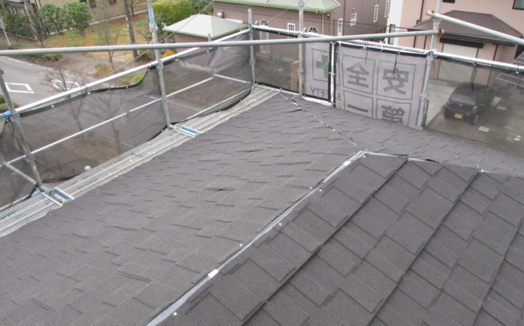 既存の棟板金と棟下地を撤去していきます。雪止めも新しく施工する屋根材に干渉しますのでサンダーで切断してフラットにしていきます。今回新しく施工する屋根材セネターは基本的には雪止め不要の屋根材となったます。表面が天然石で凹凸があるのでその摩擦で雪が引っ掛かり落ちにくい構造になっているからです。谷部分にルーフィングを捨て張りしたら軒先から順番にルーフィング(防水シート)を張り重ねていきます。ルーフィングは雨水の浸入を止める最後の砦になりますのでしっかりと規定通り重ねて張っていきます。