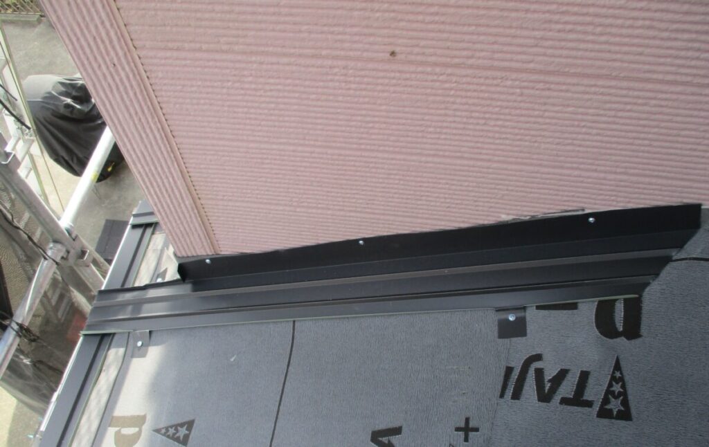 役物板金を取り付けます。役物とは屋根の端部や取り合い部分に取り付ける部材になり本体だけでは屋根の雨仕舞は完成しません。役物は重要なパーツになります。セネター本体をビスでしっかり固定しながら留めていきます。
